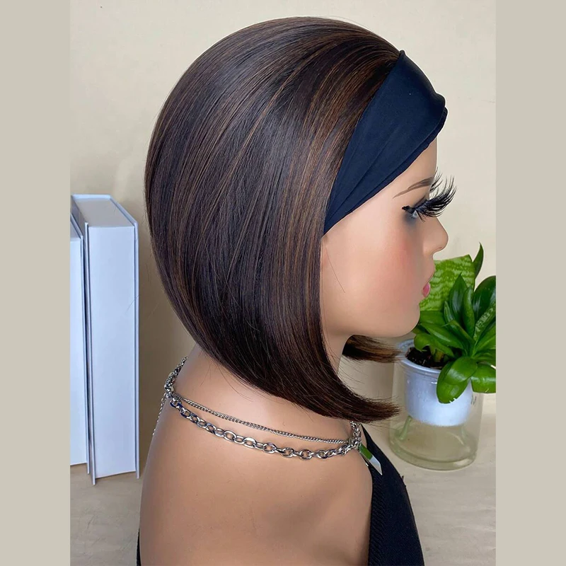10 inch short headband bob wig, short straight hair high temperature resistant fashion turban synthetic wig brown mix black