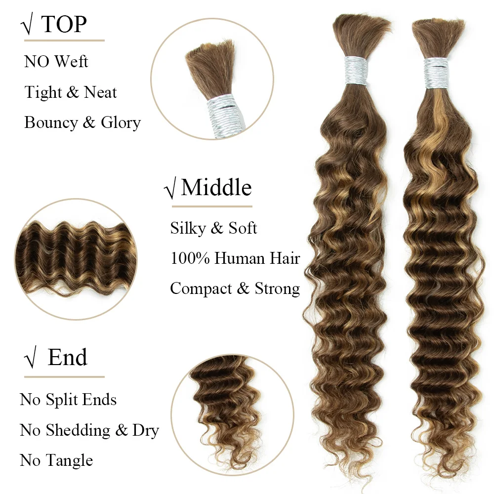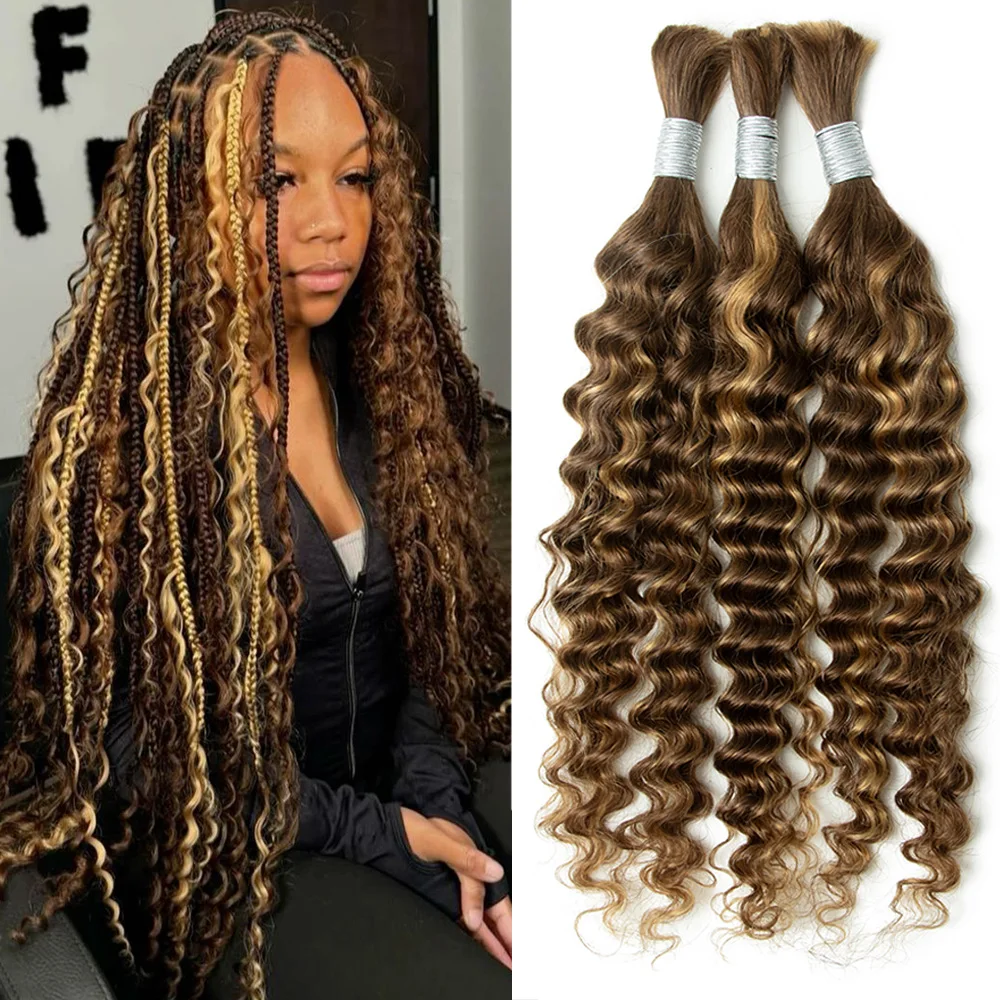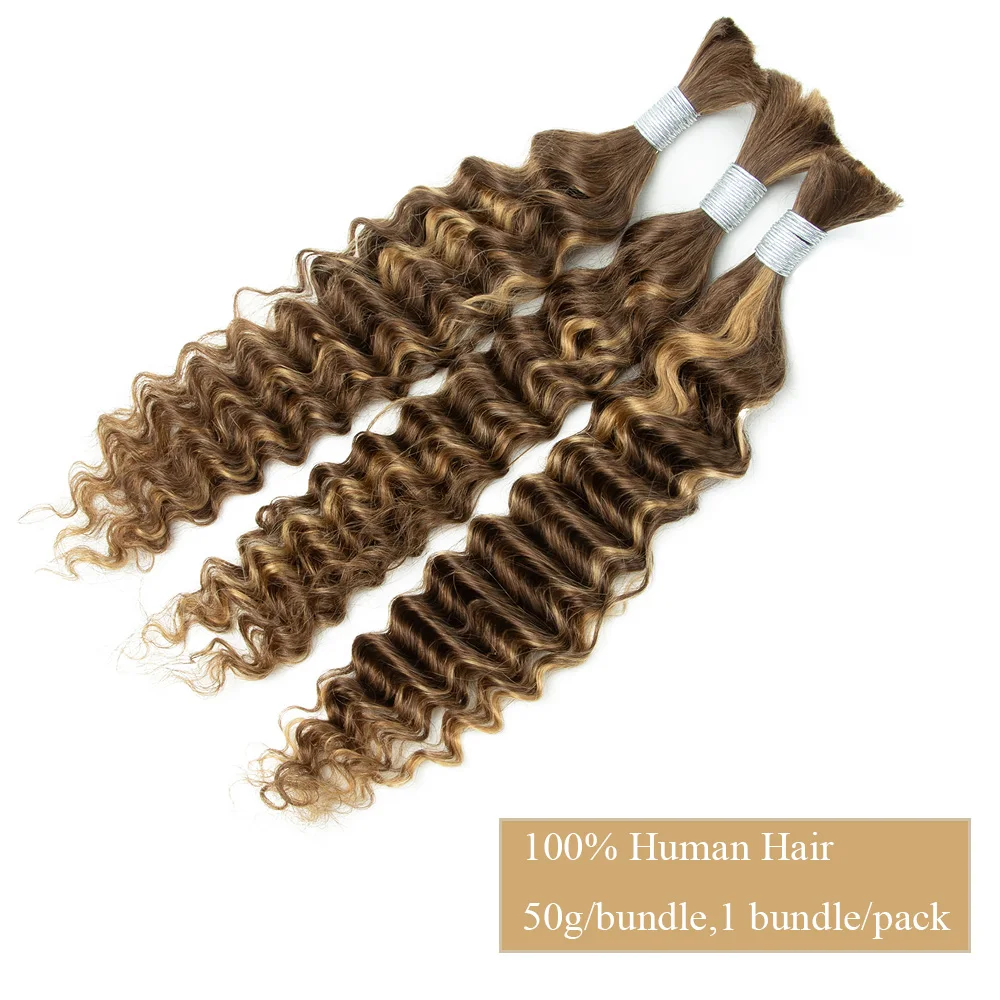 14-22'' Brown Deep Wave Human Hair Bulk For Braiding Highlights Brown No Weft Human Hair Bundles Women Boho Braids Braiding Hair