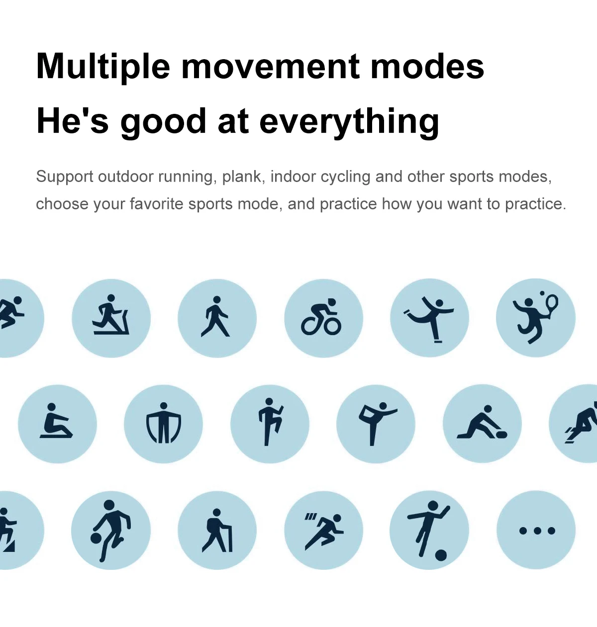 Exercise data (step count, distance, calories), indoor exercise (push ups, indoor running, plank, indoor cycling, jump rope, yoga, battle rope, sit ups, elliptical machines), outdoor exercise (outdoor walking, outdoor running, outdoor cycling, mountaineering, badminton, basketball, football)