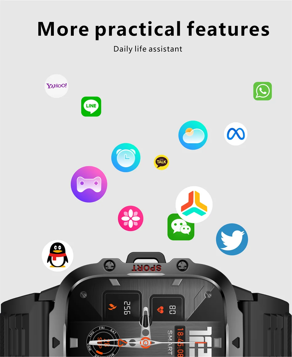 Function: Passometer,fitness tracker,sleep tracker,Message Reminder,Call Reminder,Answer Call,Dial Call,Push Message,Altitude Meter,Big Three Needles,24 hour instruction,Chronograph,Alarm Clock,Small Second,World Time,Power Reserve,week,Month,Heart Rate Tracker,Interactive Music,Noctilucent,Calendar,Countdown,Calculators