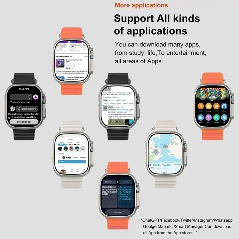 Supports over 200 dials Multi sport modes Dial pad Activity Real sleep Real heart rate The weather Blood oxygen music. Breathing training AI voice Exercise records contacts. Call records Calculator. Voice memo: 9 types of games Alarm clock Stopwatch. Timer Flashlight.