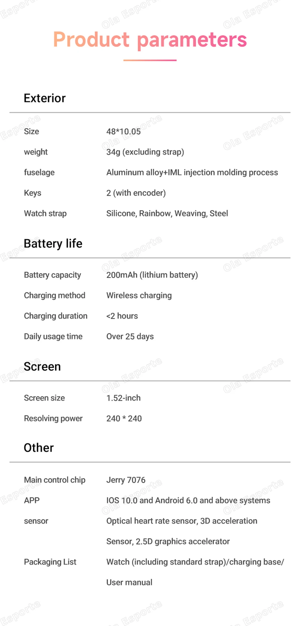 10.Other functions: pedometer,sedentary reminder, Calendar,motion tracker,alarm clock,weather push, stopwatch, timer, stopwatch,calculator, World clock, camera remote control, find your phone.