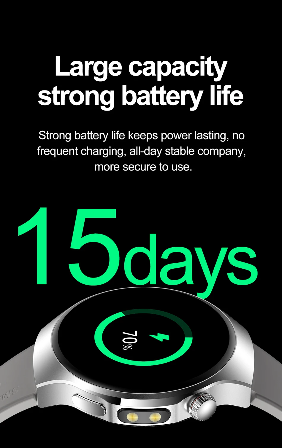 8. We understand customers value compatibility and convenience. This smartwatch seamlessly connects with iOS and Android devices, making it the ideal choice for all smartphone users. Long-lasting battery life and water-resistant design ensure worry-free wear anytime, anywhere.