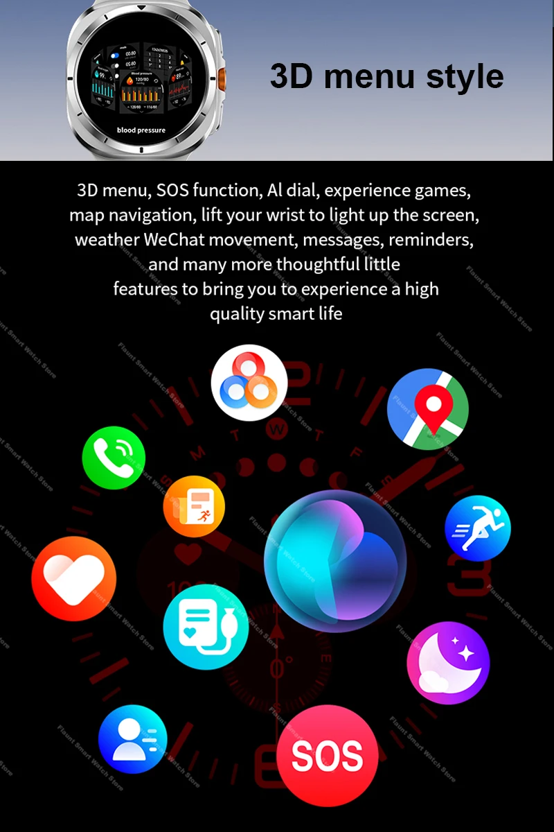 Other Features: 3D menu, SOS function, OTA updates, shortcut bar (control center), various health metrics (pedometer, distance, calorie), weather forecast, stopwatch, countdown timer, find phone, find bracelet, shake-to-take-picture, dial switching, music control, settings customization (language selection, brightness adjustment, vibration settings, etc.), passcode lock, breathing exercises, power-saving modes, voice assistant (SIRI), calling functions, split-screen (sidebar), flashlight, payment codes, QR code scanning, business card exchange, calculator, engineering test mode, calendar, Alipay payment, map navigation, short video control, compass