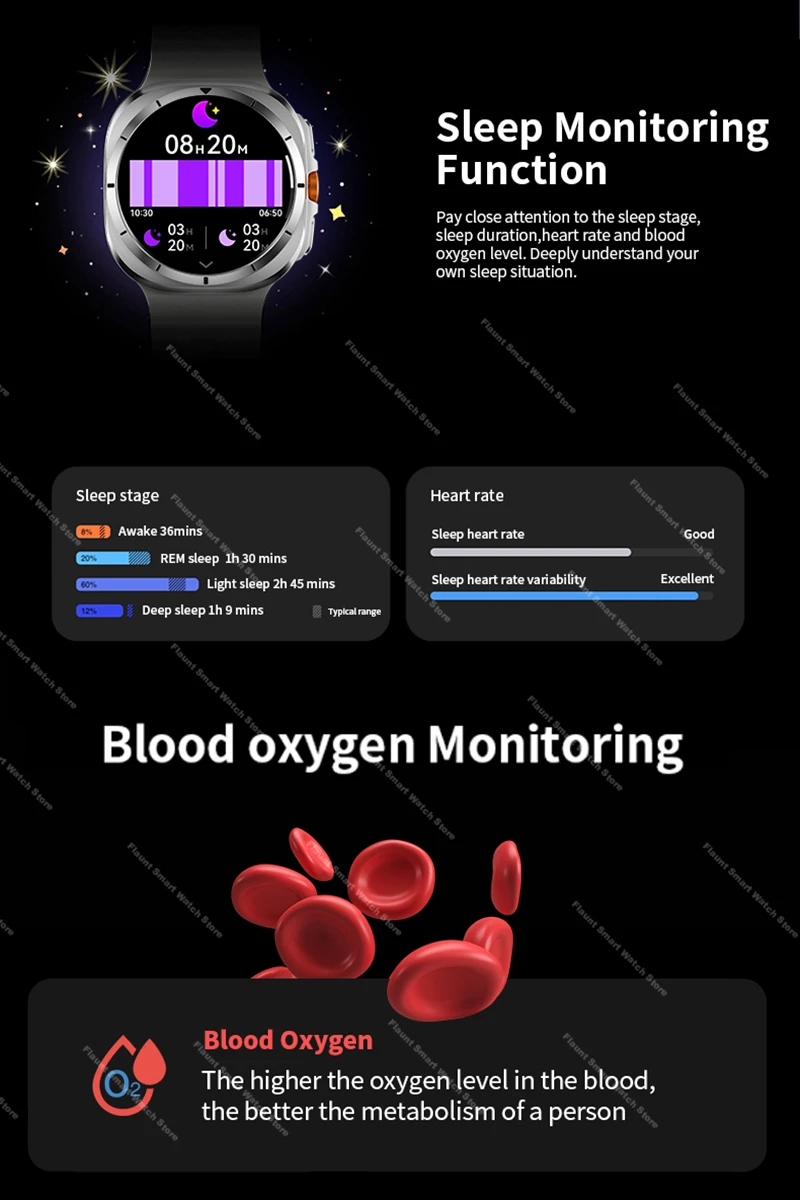 Health: Blood pressure monitoring, heart rate monitoring, blood oxygen level monitoring, sedentary reminders, sleep monitoring