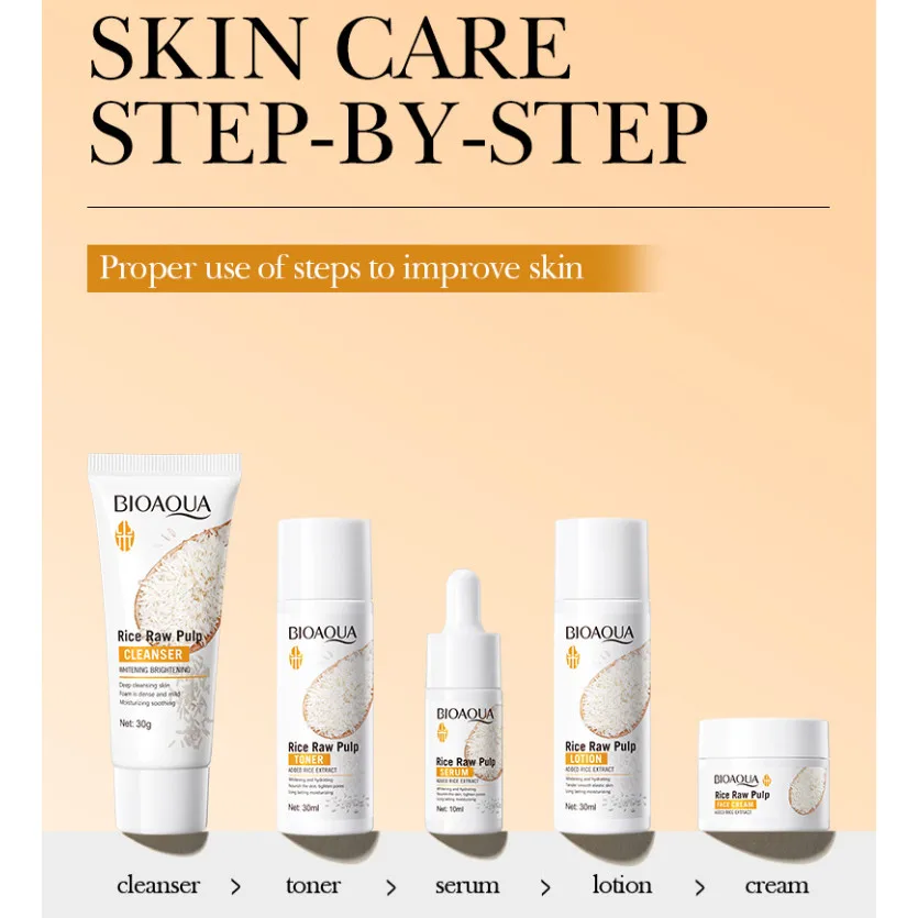 To achieve the best results with the BIOAOUA 5pcs Rice Raw Whitening Travel Set, begin by cleansing your face with the rice-based cleanser. Apply a small amount to damp skin, gently massaging in circular motions to remove impurities. Rinse thoroughly with lukewarm water. Next, use the toner to balance your skin's pH. Soak a cotton pad with the toner and swipe it across your face. Follow with the whitening serum, applying a few drops to your fingertips and gently pressing it into your skin. Finally, finish with the moisturizer, ensuring even coverage to lock in hydration. For optimal results, use this set twice daily, morning and night, and incorporate it into your skincare routine consistently.