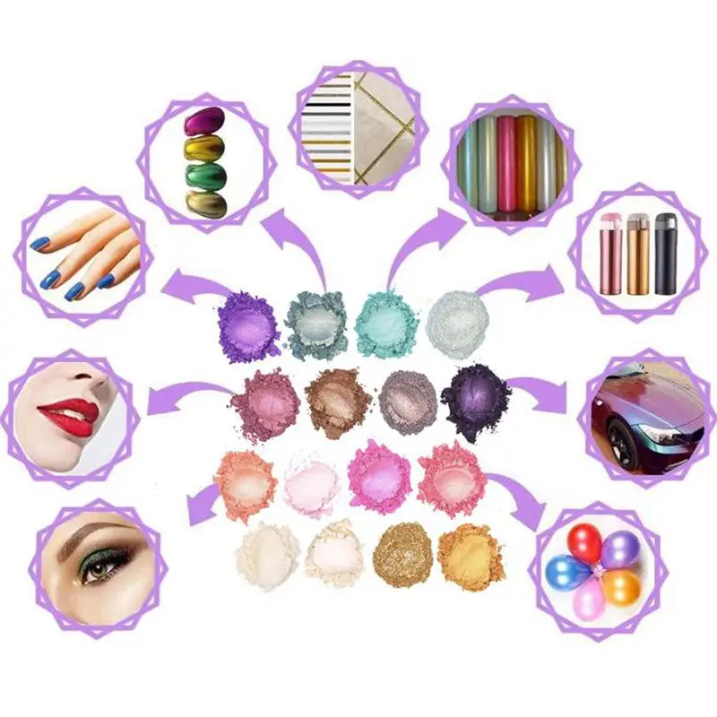 Applications:pearl powder is widely used in automobile, bicycle paint, decorative architectural coatings, printing ink, leather, pearlescent plastic products, cosmetics Eye shadow Nail Polish can also be used in papermaking, printing and dyeing, printing, Toy paint, crafts, rubber, ceramics and other industries.