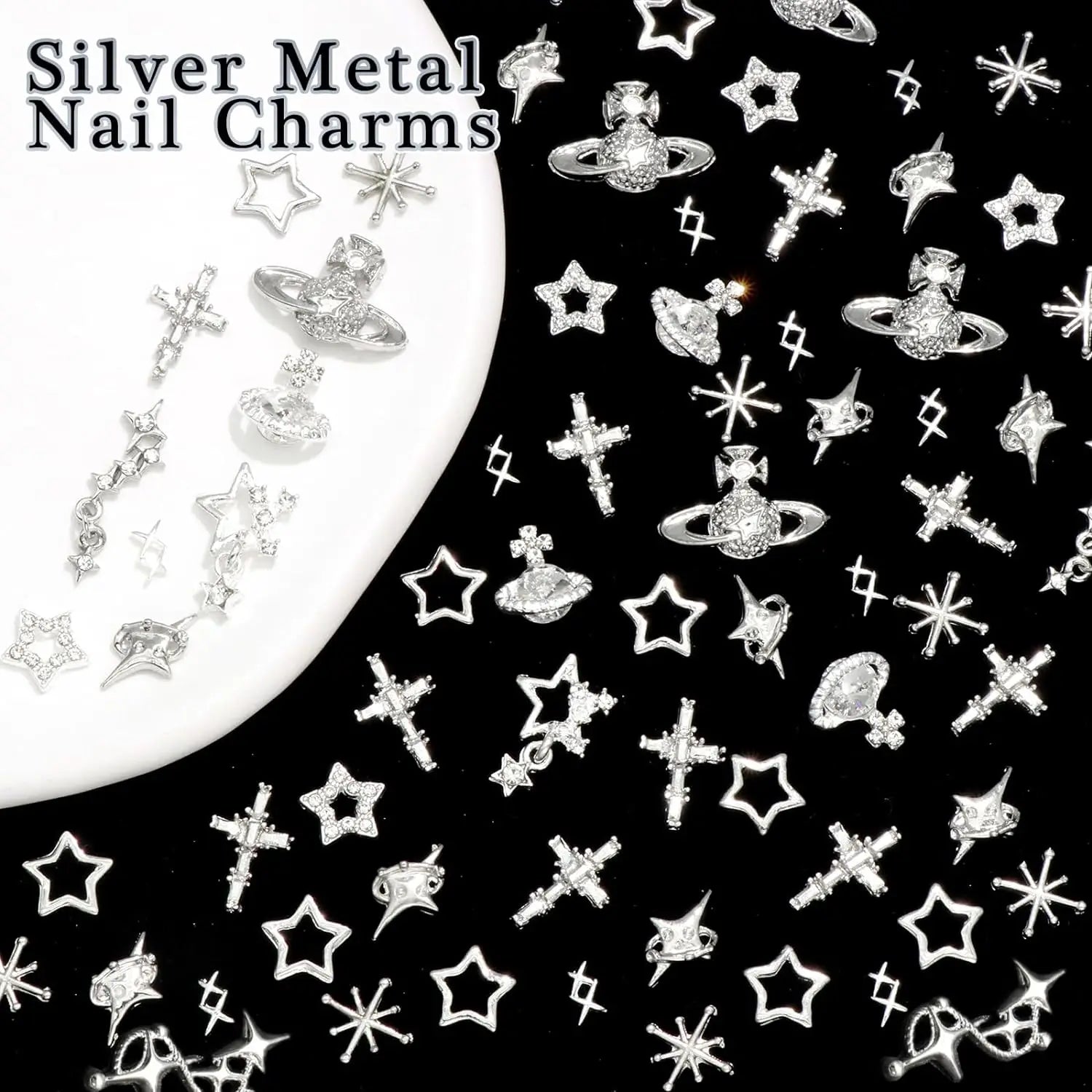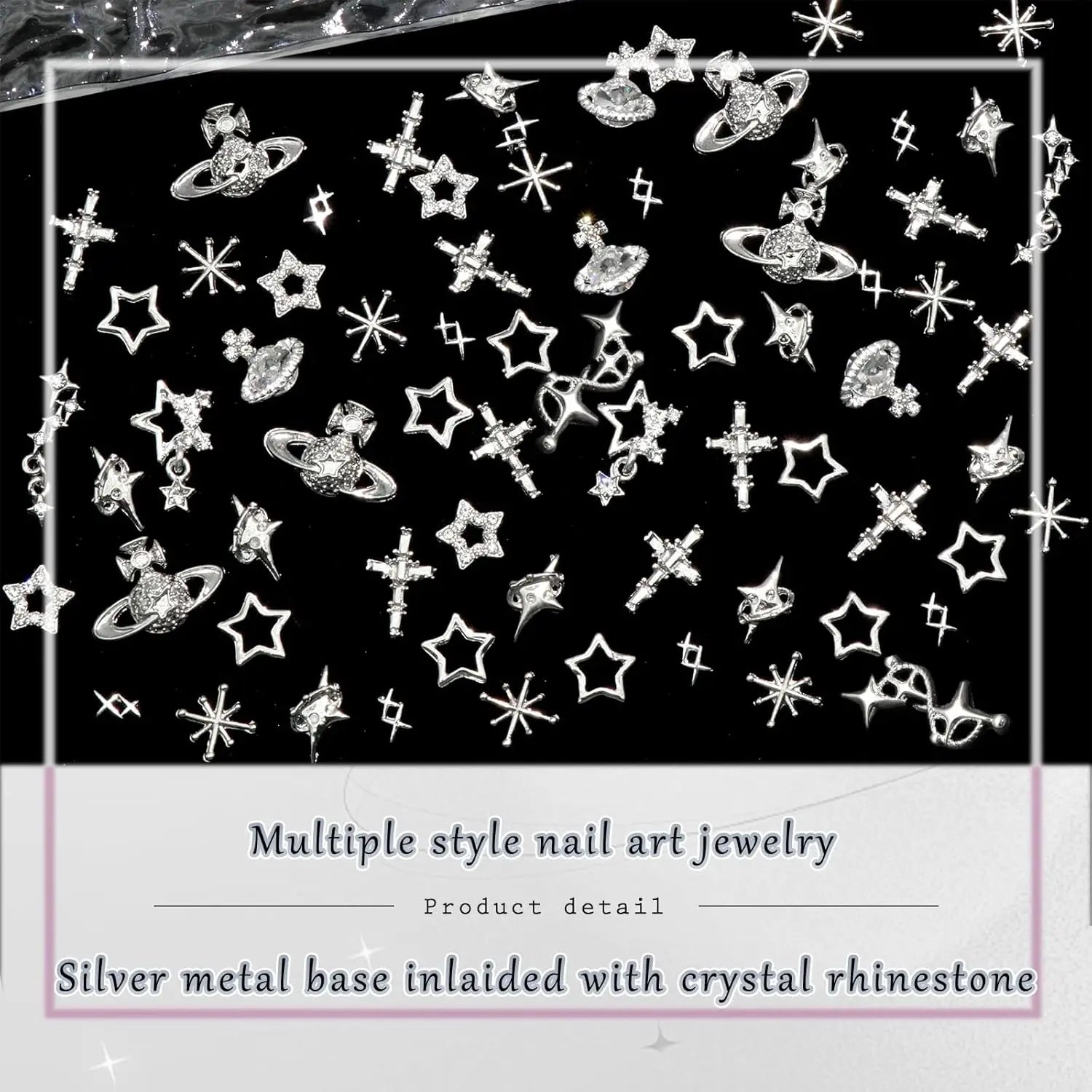 75PCS Cross Nail Charms Silver 3D Star Charms and Gems Saturn Planet Nail Art Jewelry Multi Style Nail Rhinestones for Nails