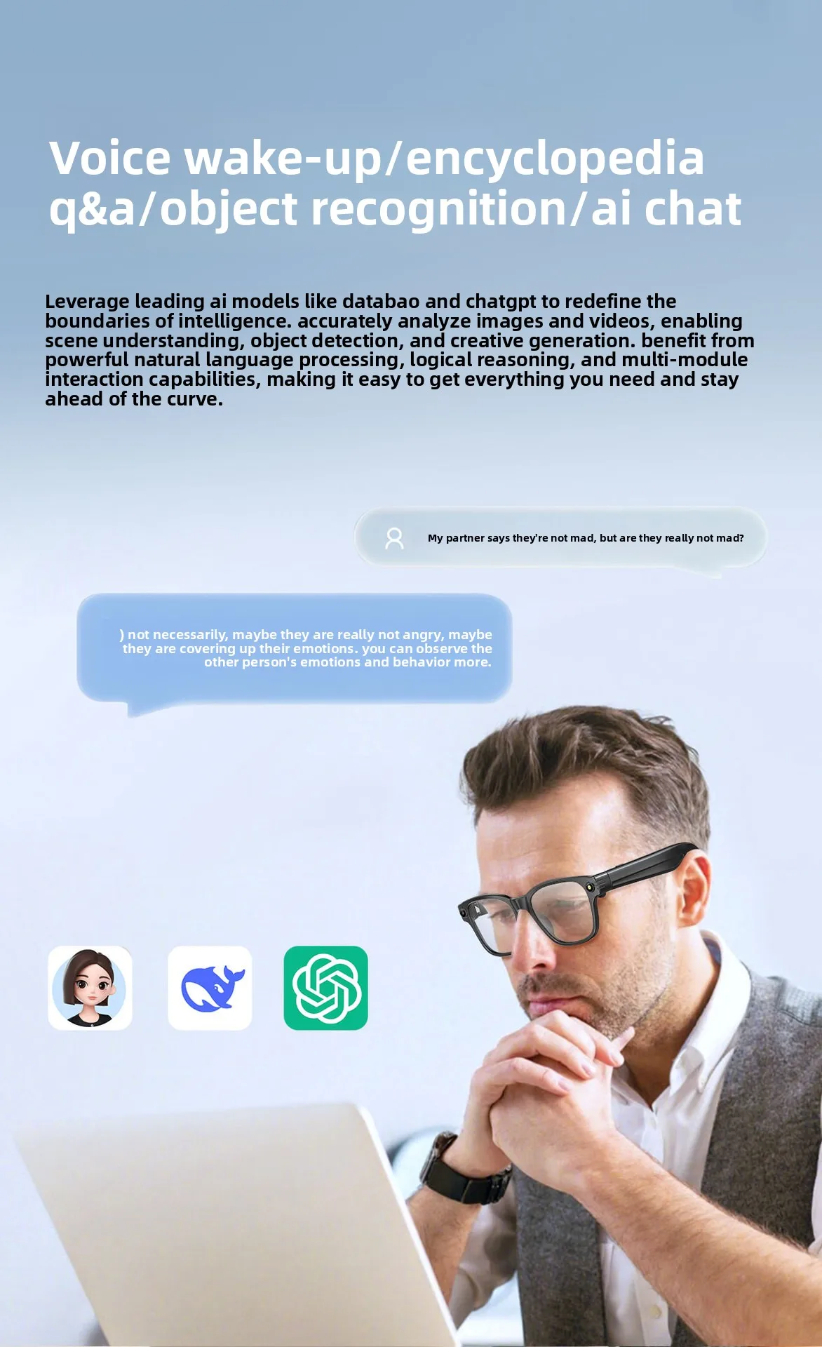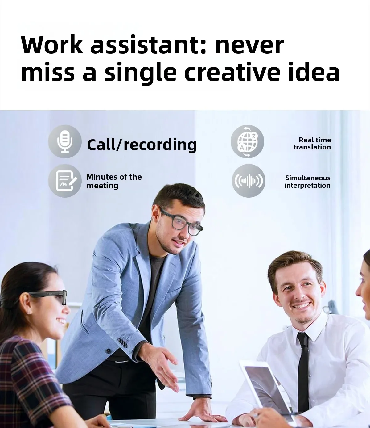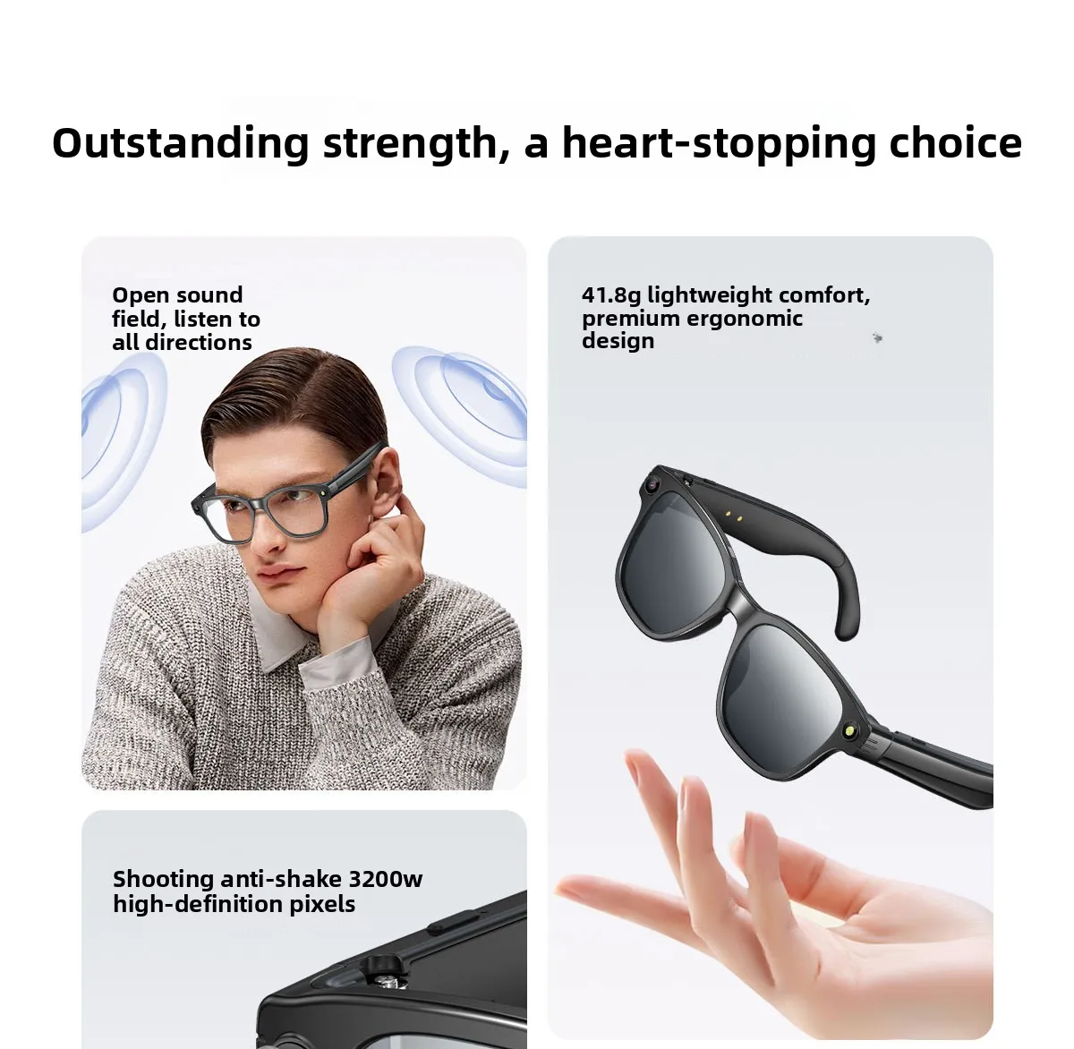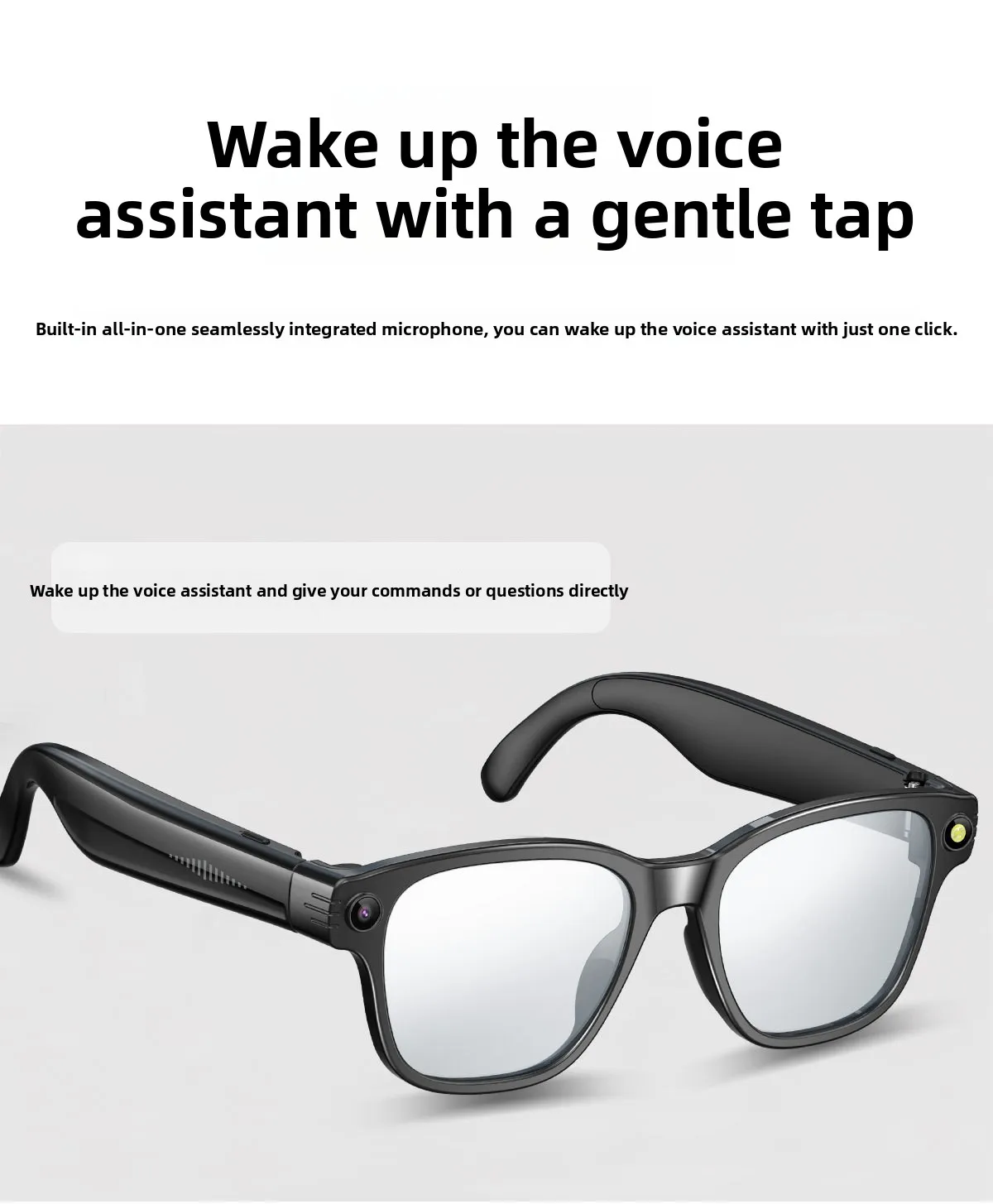 | Main function | 80010,000 high definition camera to take pictures, anti-shake+1200PHigh-resolution video recording, dual mic noise reduction system, audio recording,wiff+Bluetooth real-time transmission, wear detection, music control, voice assistant, Bluetooth call, large battery270mAhSound quality, high definition speakers, object recognition, intelligenceAIMultilingual translation, etc |