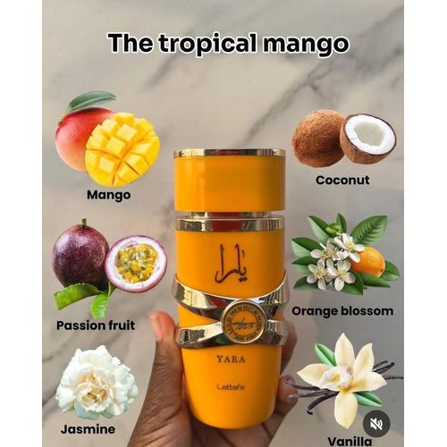 Yara Tous by Lattafa Perfumes is a fragrance for women. This is a new fragrance. Yara Tous was launched in 2023. Top notes are Mango, Coconut and Passionfruit; middle notes are Jasmine, Orange Blossom and Heliotrope; base notes are Vanilla, Musk and Cashmeran.