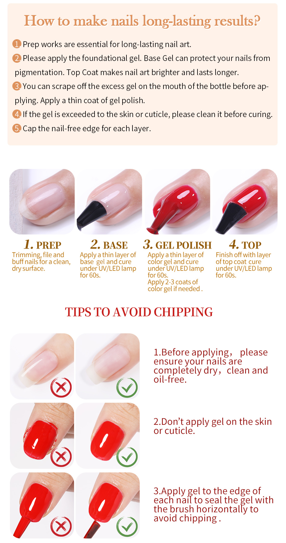 Step 2. Apply base gel first,which can make polish lasting longer, cure with UV lamp or LED lamp. (Necessary)