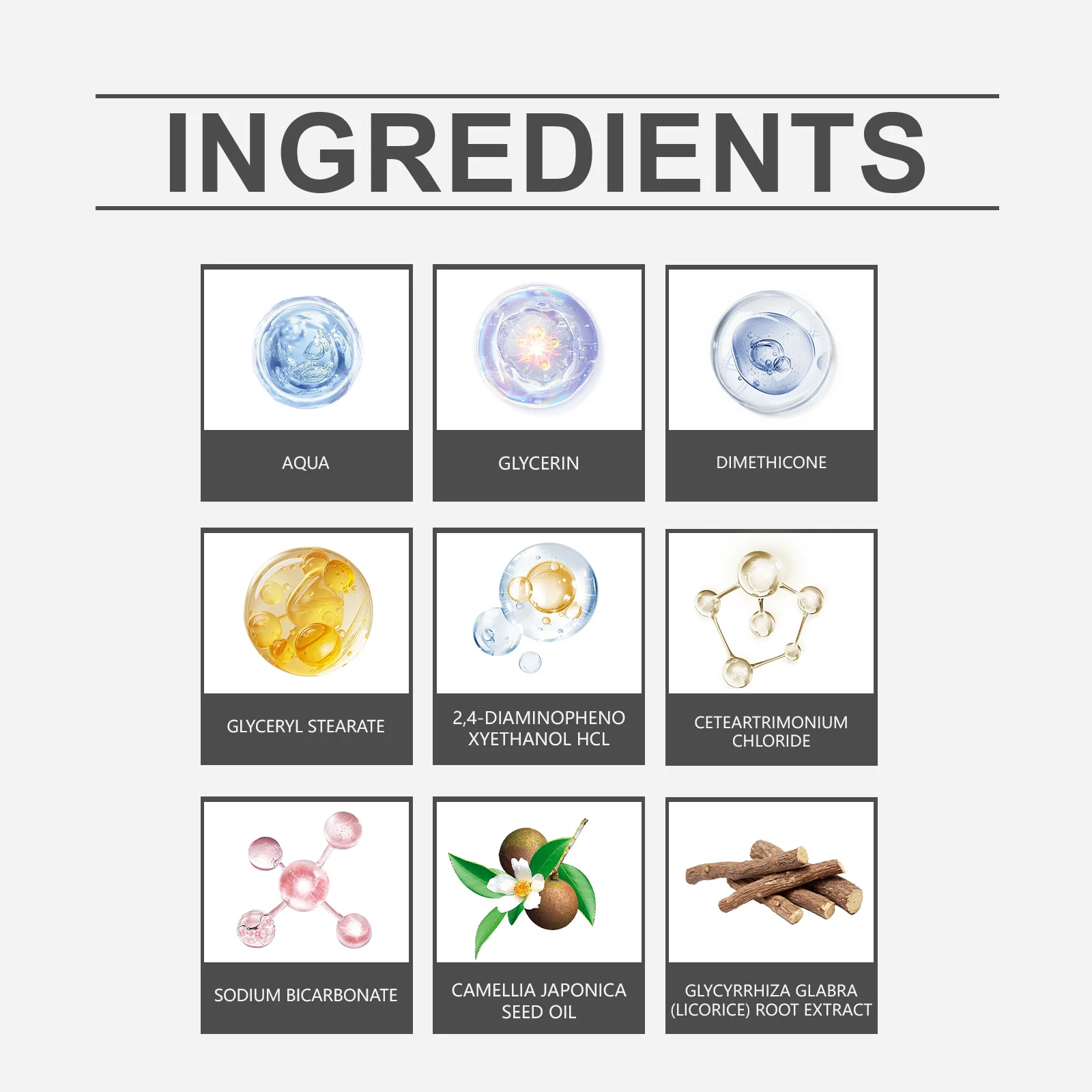 INGREDIENTS:AQUA、GLYCERIN、DIMETHICONE、GLYCERYL STEARATE、2,4-DIAMINOPHENOXYETHANOL HCL、CETEARTRIMONIUM CHLORIDE、SODIUM BICARBONATE、CAMELLIA JAPONICA SEED OIL、GLYCYRRHIZA GLABRA (LICORICE) ROOT EXTRACT