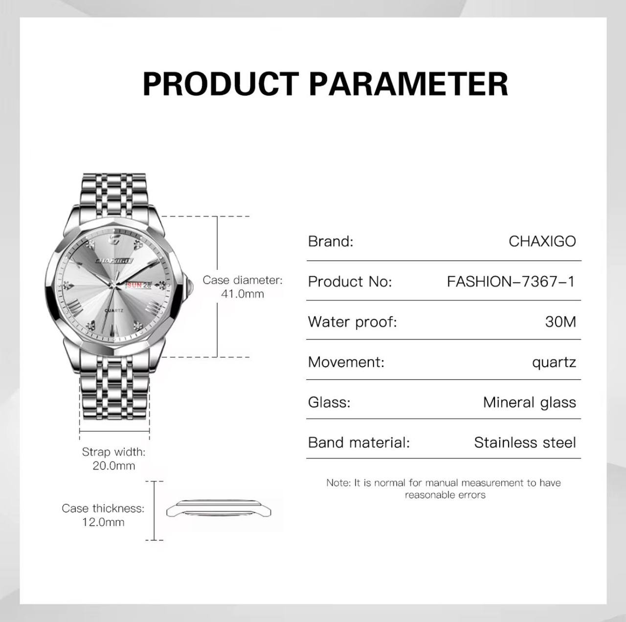 The CHAXIGO DAY & DATE DISPLAY #7367 watch features precise quartz movement with clear day and date functions, ensuring reliable timekeeping and easy schedule tracking. Designed with a durable stainless steel strap and high-strength mineral glass, it combines strength and style. Its 30-meter water resistance adds practical protection, making it suitable for everyday wear and light water exposure. This watch offers a perfect balance of functionality and durability for the discerning user.