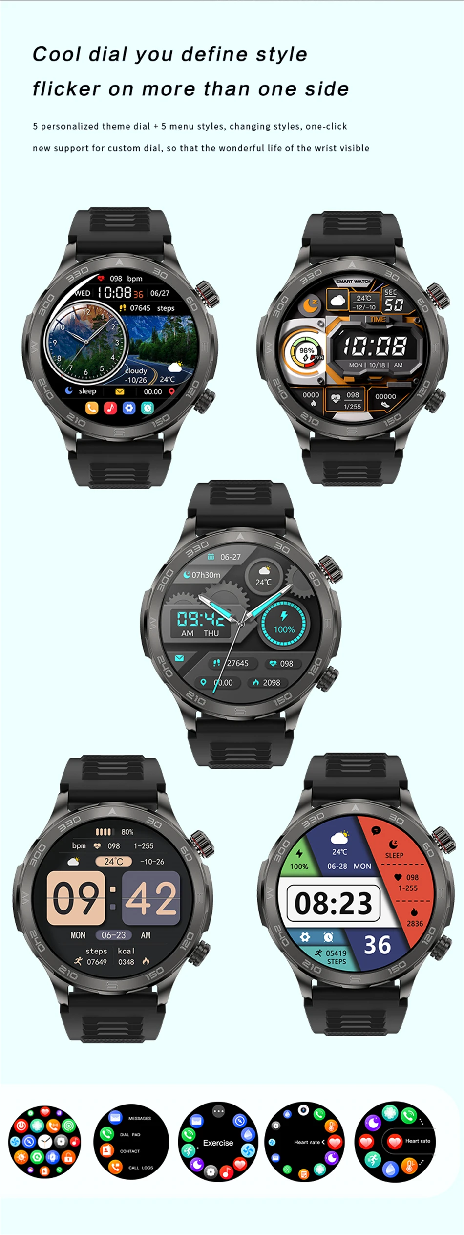 Main functions: HD bluetooth call, resting pointer, customized picture, APP background download picture, QR code (download, connect 2 in 1), find phone, calendar, exercise track, restart, message push, remote photo, paypal, sleep monitoring, altitude, temperature monitoring, weather, blood pressure, voice assistant, my QR code, key definition settings, blood oxygen, respiration, dials, pedometer, timer, Menu Style, Restore Factory, Settings (Nimble Island, Drain, Power Saving Mode, Screen Off Time, Wrist Lift Brightness, NFC, Brightness, Button Definition, Vibration Intensity, Do Not Disturb Mode, Password Setting, Language, Time & Date Setting, Connect APP, Restore Factory, Restart, Shutdown, About), Phone (Contacts, Call Logs, Dialing Keypad, Call Settings, Emergency Call), Calculator, Heart Rate, Language Selection, About Watch Information, Alarm Clock, Sport Mode, Bluetooth Music, Bluetooth Call, Stopwatch, Screen Off Time, Vibration Intensity, Time & Date Settings, Passcode Lock.