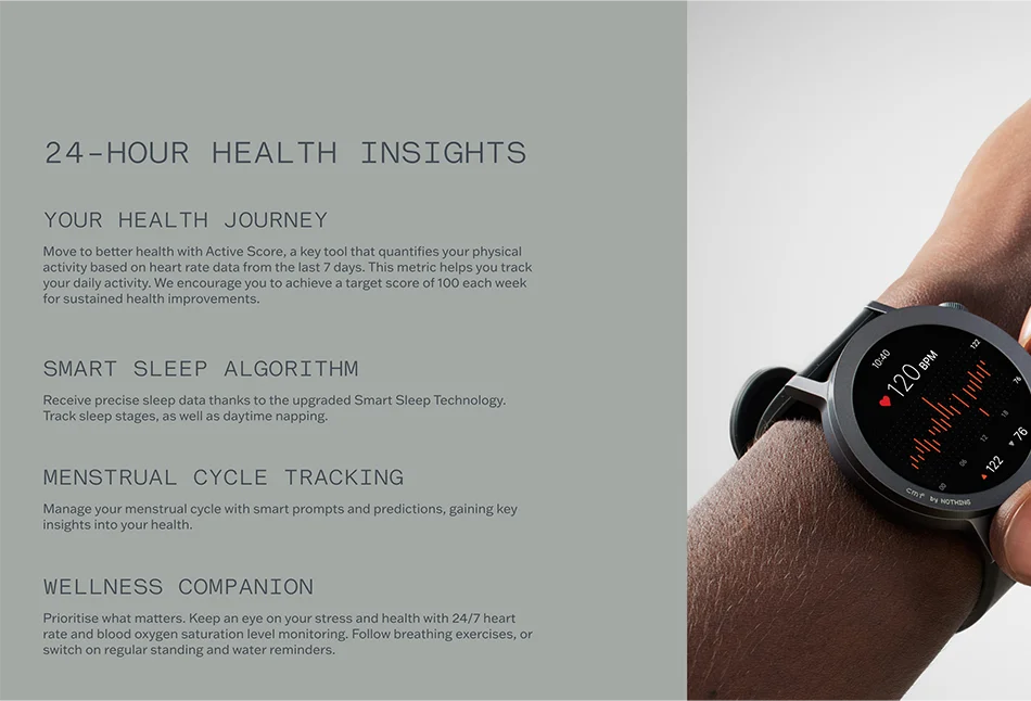 Health---- Active Score,24-hour heart rate/SpO₂ monitoring,Smart sleep algorithm,Menstrual cycle tracking,All-day step count,Calories,Resting heart rate,Abnormal heart rate alert,Abnormal blood oxygen alert