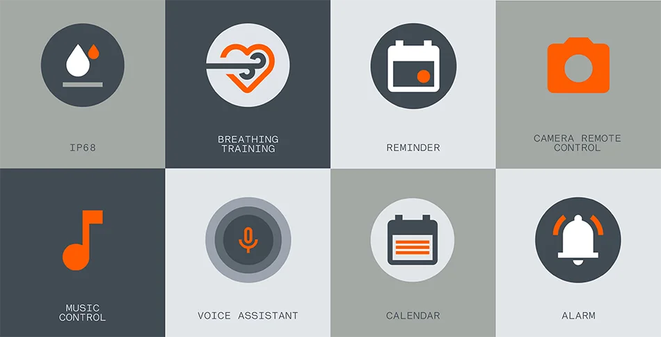 Other features----Microphone,Speaker,Bluetooth Call,Loud Watch Faces,Photo Album Watch Faces,Watch Faces Switching,Breathing Training,Message notification,Music control,Timers,Stopwatch,Alarms,Weather,Find my phone,Flashlight,Camera remote,Reminder,Voice Assistant,Calendar,Calculator,World clock