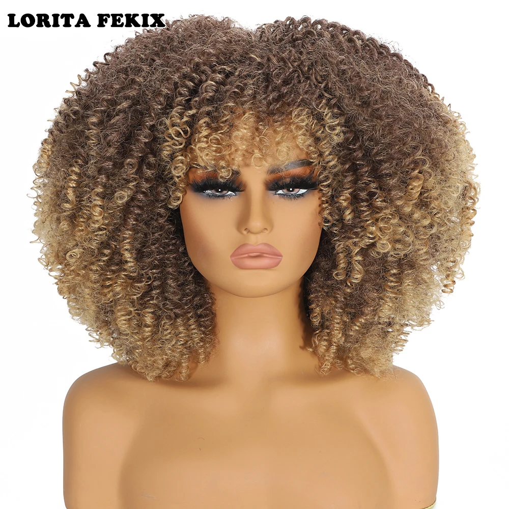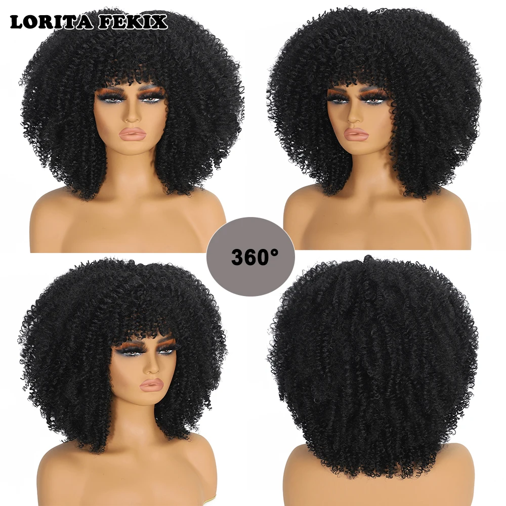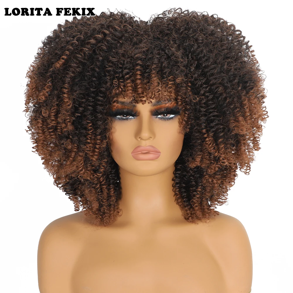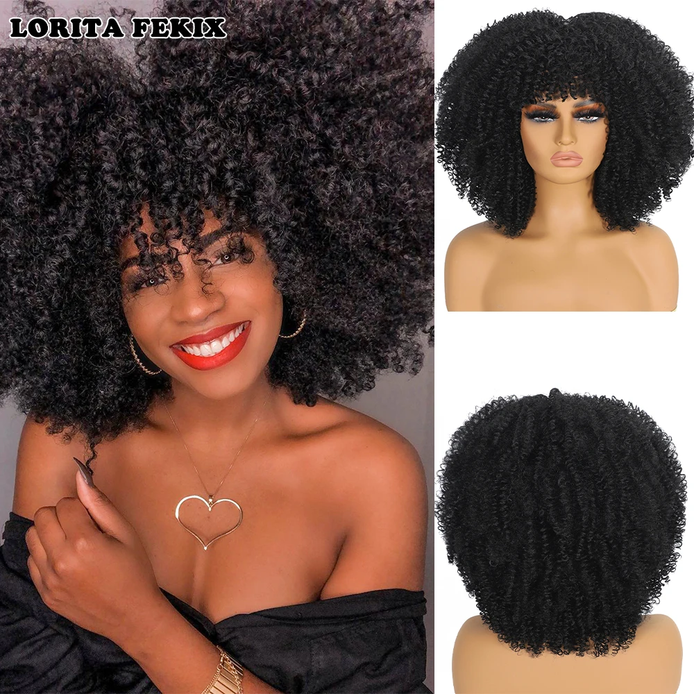 Curly Afro Wigs for Black Women Synthetic Afro Kinky Curly Wig with Bangs Heat Resistan Short Kinky Curly Wigs for Daily Party