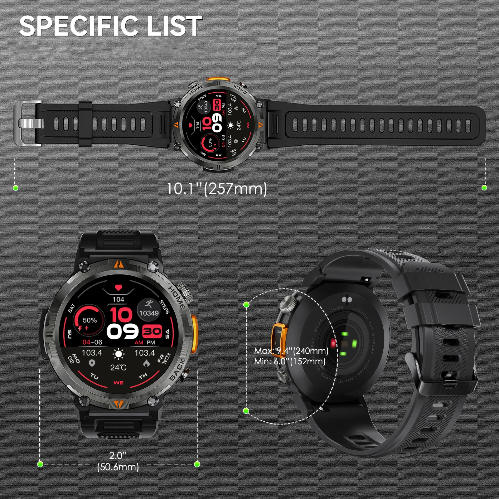 [Military Smartwatch with Flashlight]: Military smartwatch is made of zinc alloy and a plastic back tested for extreme temperature, low pressure and dust resistance, rugged enough to withstand harsh environmental conditions. Rugged smart watch is equipped with a powerful flashlight on the side, which can be conveniently used in dark environments, whether you are looking for something or playing outdoor sports, it can light up the way for you, a powerful assistant for outdoor activities.