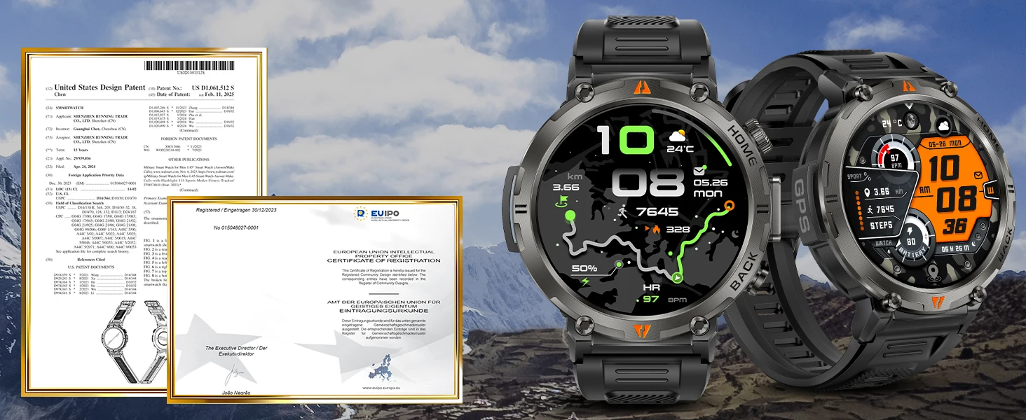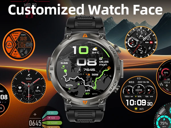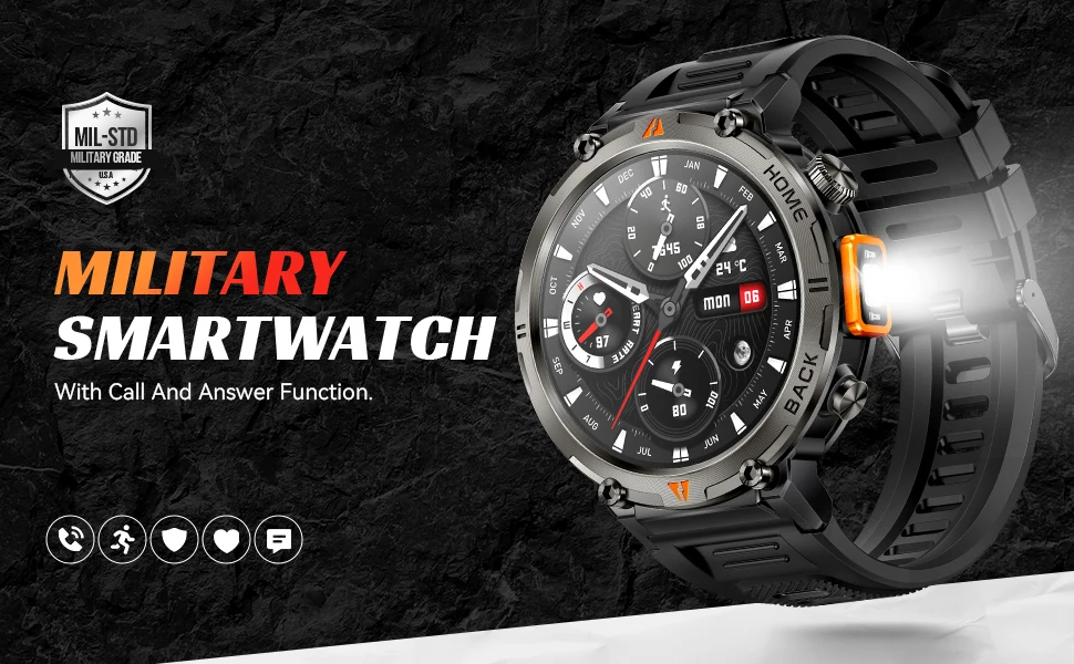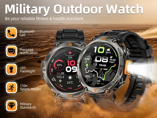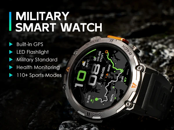 1. Military smartwatch in zinc alloy and plastic, designed for outdoor activities.