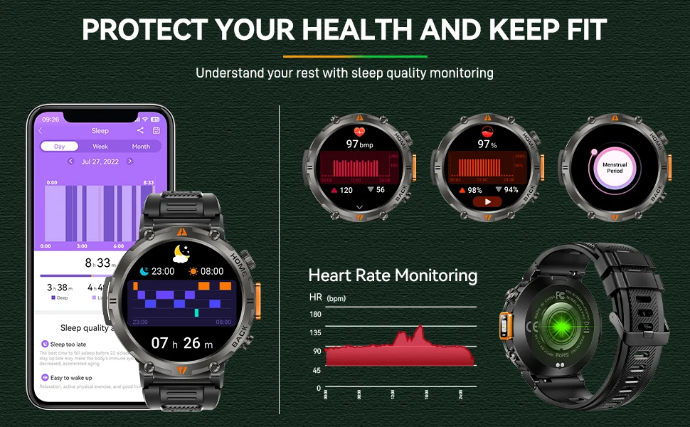 Metrics measured: Heart Rate Monitor,Blood Oxygen Monitor,Sleep Monitor,Stress Monitor