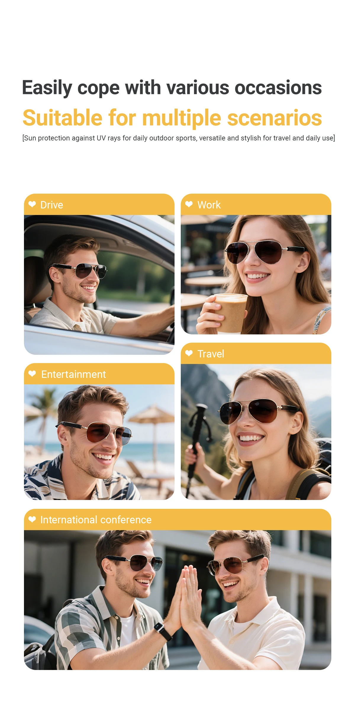 *AI Bluetooth Audio Call Fashion Smart Glasses: Equipped with functions such as AI intelligent voice and video real-time translation, AI dialogue and Q&A, AI intelligent translation (including translator mode and the translation mode combining glasses and mobile phone, which can customize the translation of more than 163 languages)