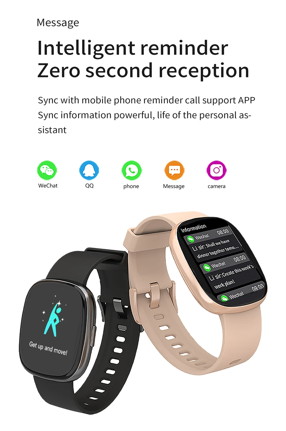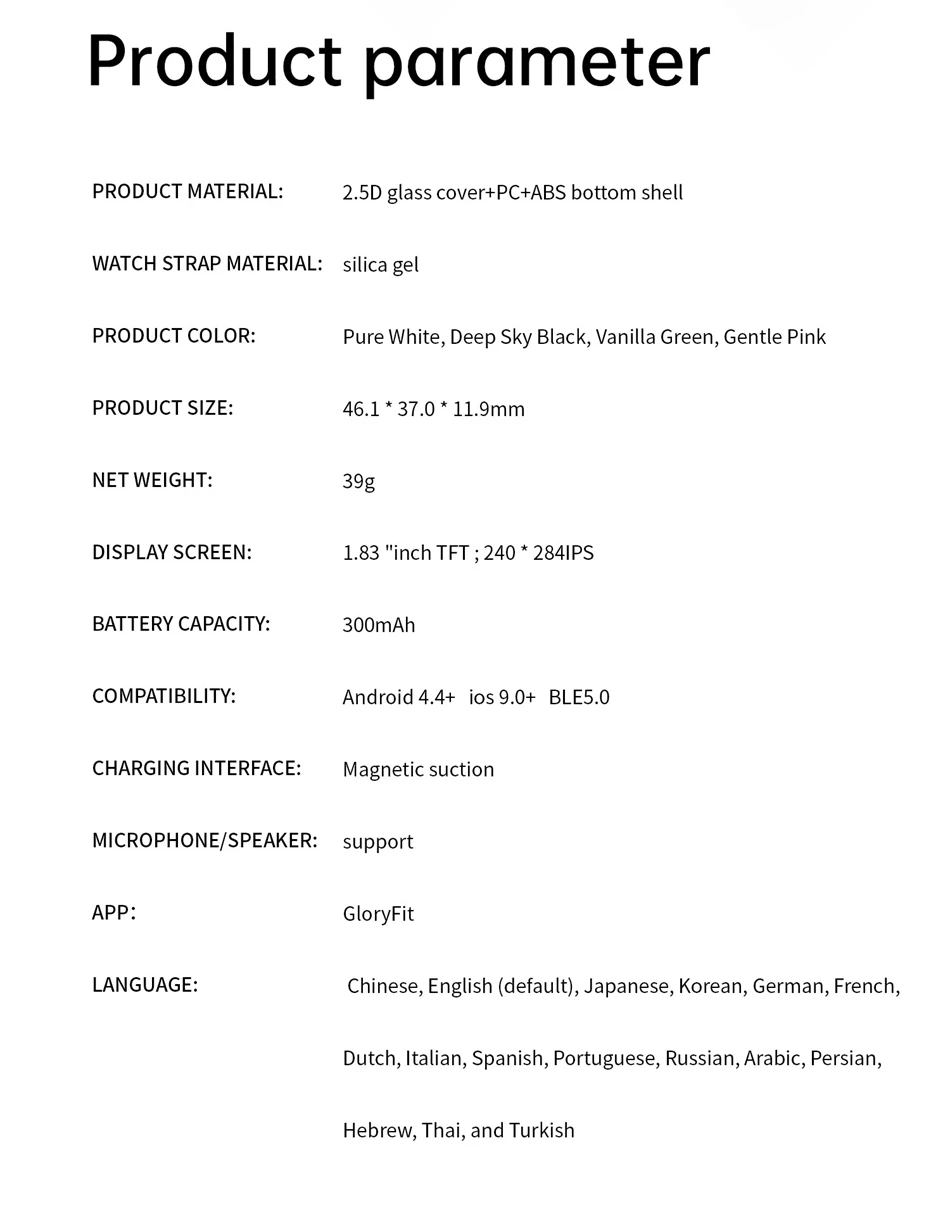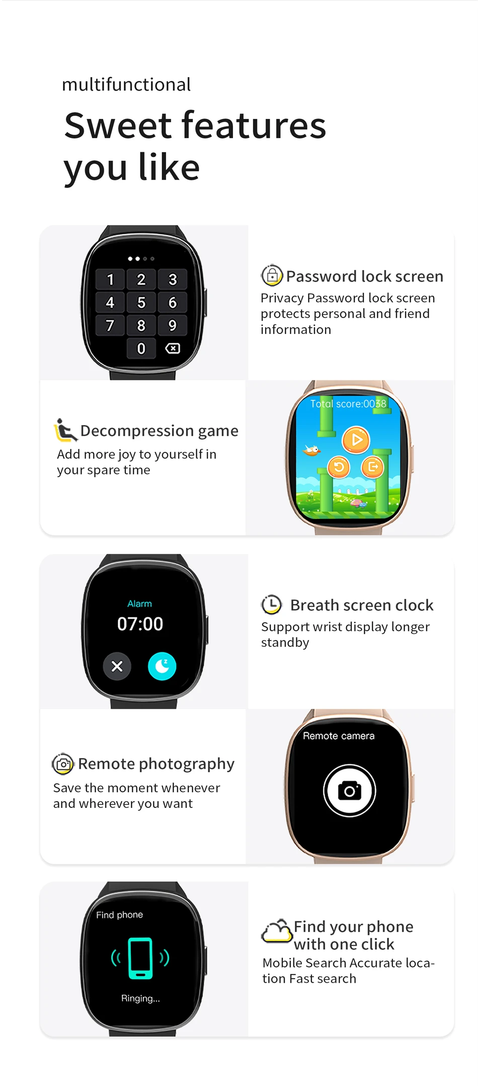 More functions: GPS Movement track,Supports multiple languages, built-in multiple freely replaceable dials, voice assistant, weather forecast, heart rate, blood oxygen, sleep, step monitoring, multiple sports support, wearing detection, alarm clock reminder, incoming call reminder, sedentary reminder, breathing Training, stopwatch, timer, do not disturb mode, 24-hour heart rate, smart reminder, smart alarm clock.