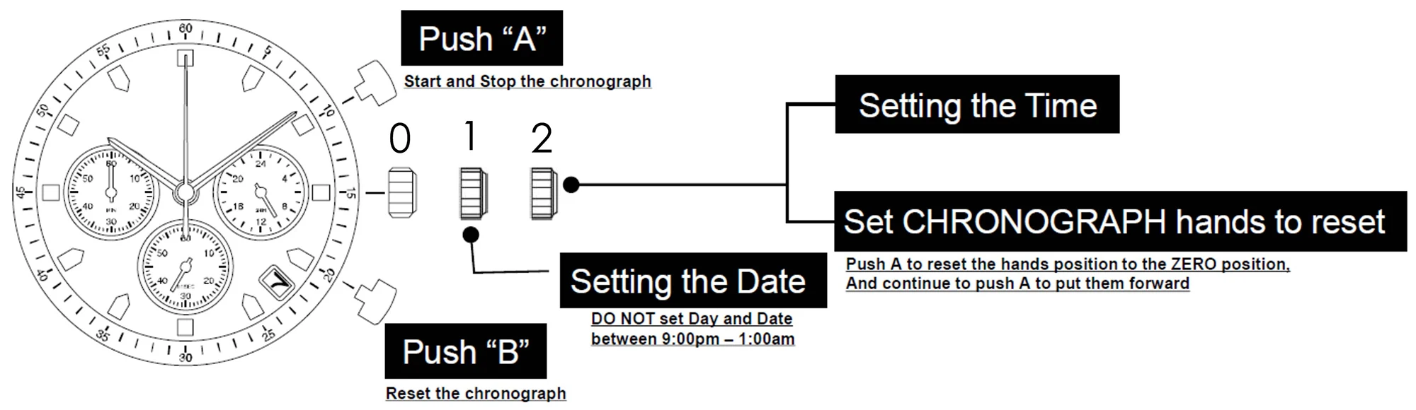 Functions Hours, minutes, central chronograph seconds, 60 minute counter, 24 hour hand, date