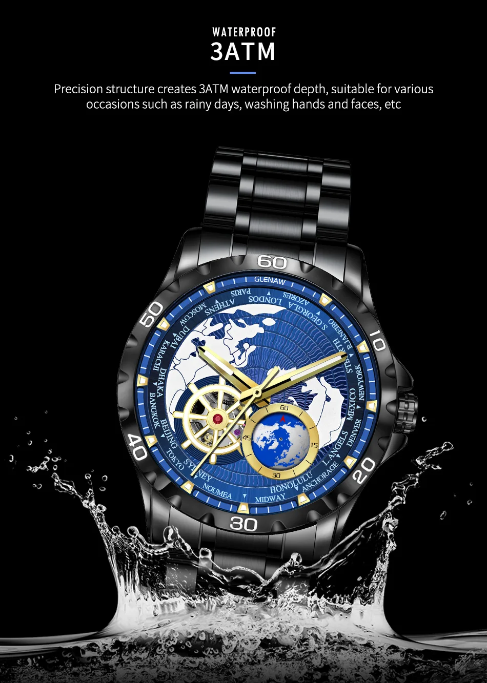 GLENAW 2025 New Earth Series Mechanical Watch Men Rotating Earth Dial Night Light Waterproof Top Luxury Design Mechanical Watch