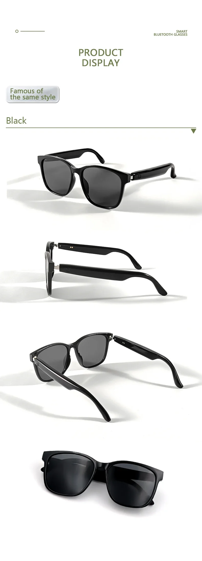 AI voice wake-up, AI photo recognition, AI intelligent question-and-answer interaction, AI smart translation, high-definition photography and video recording (with anti-shake function), recording, Wi-Fi transfer of photos, videos, and recordings to phone, slide to adjust volume, wear detection, dual microphone noise reduction, call noise reduction, intelligent voice assistant, Bluetooth calls, music playback (switch, pause music), low power consumption Jerry + Allwinner main control chip, long-lasting battery life, dual physical buttons plus slide touch for convenient operation, 30 grams lightweight overall weight for comfortable wearing, customizable sunglasses, blue light protection, color-changing, myopia, and other lenses, {need to be customized}