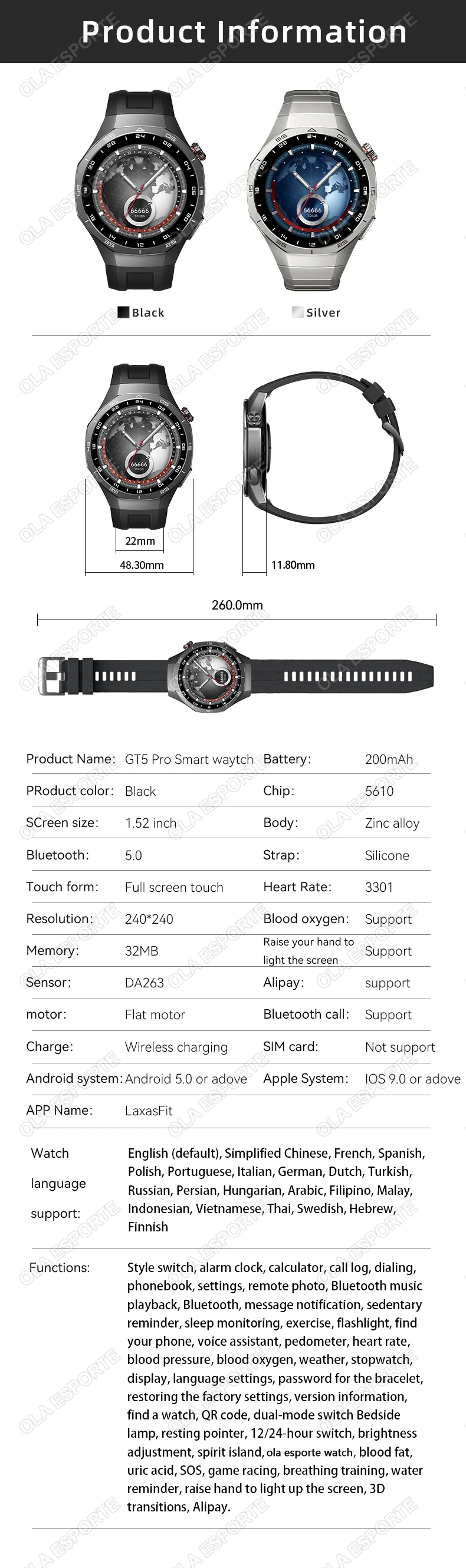 Function: Passometer,fitness tracker,sleep tracker,Mood Tracker,Message Reminder,Call Reminder,Answer Call,Dial Call,REMOTE CONTROL,Push Message,Altitude Meter,tourbillon,Big Three Needles,24 hour instruction,Chronograph,Alarm Clock,Small Second,World Time,Permanent Calendar,Power Reserve,GMT Two Places,Perspective Window,week,Phase of the Moon,Speed Measurement,Month,Heart Rate Tracker,Interactive Music,Lighting,Countdown,Oxymeter