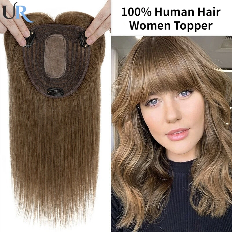 Hair Topper With Bangs Women 100% Human Hair Wigs Clip In Hairpieces Blonde Natural Straight Hair Topper Silk Base 35cm