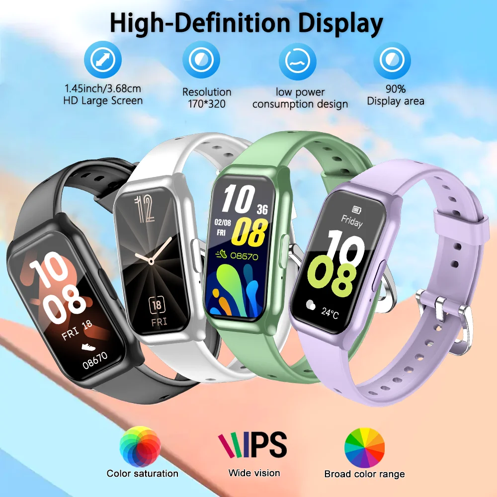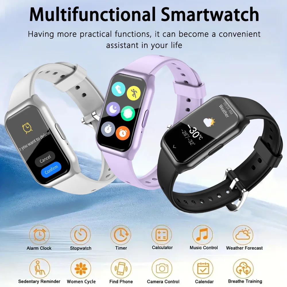 Alarm Clock, Customized Dial, Weather Forecast, Do Not Disturb Mode, Brightness Adjustment, Screen On Time Adjustment,, Photo Control, Music Control, Family Health, Stopwatch, Countdown Timer.