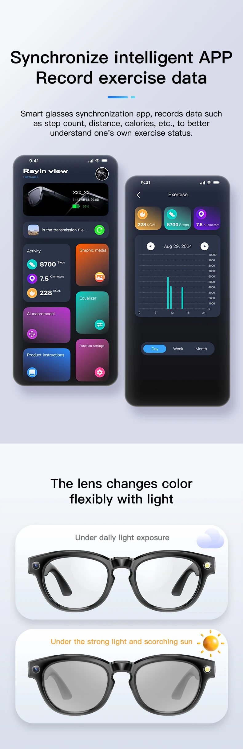 ★ Functions: Camera function (photo taking & video recording), WIFI transmission (image/video/audio), sound recording, AI translation, AI photo recognition, AI intelligent question & answer interaction, wireless call (answer & reject), voice assistant , built-in headphones & speaker (stereo sound), music playback, exercise record (steps, distance, calories), anti blue light, UV protection.