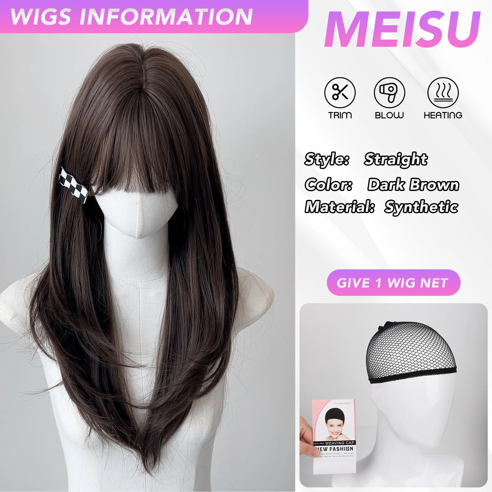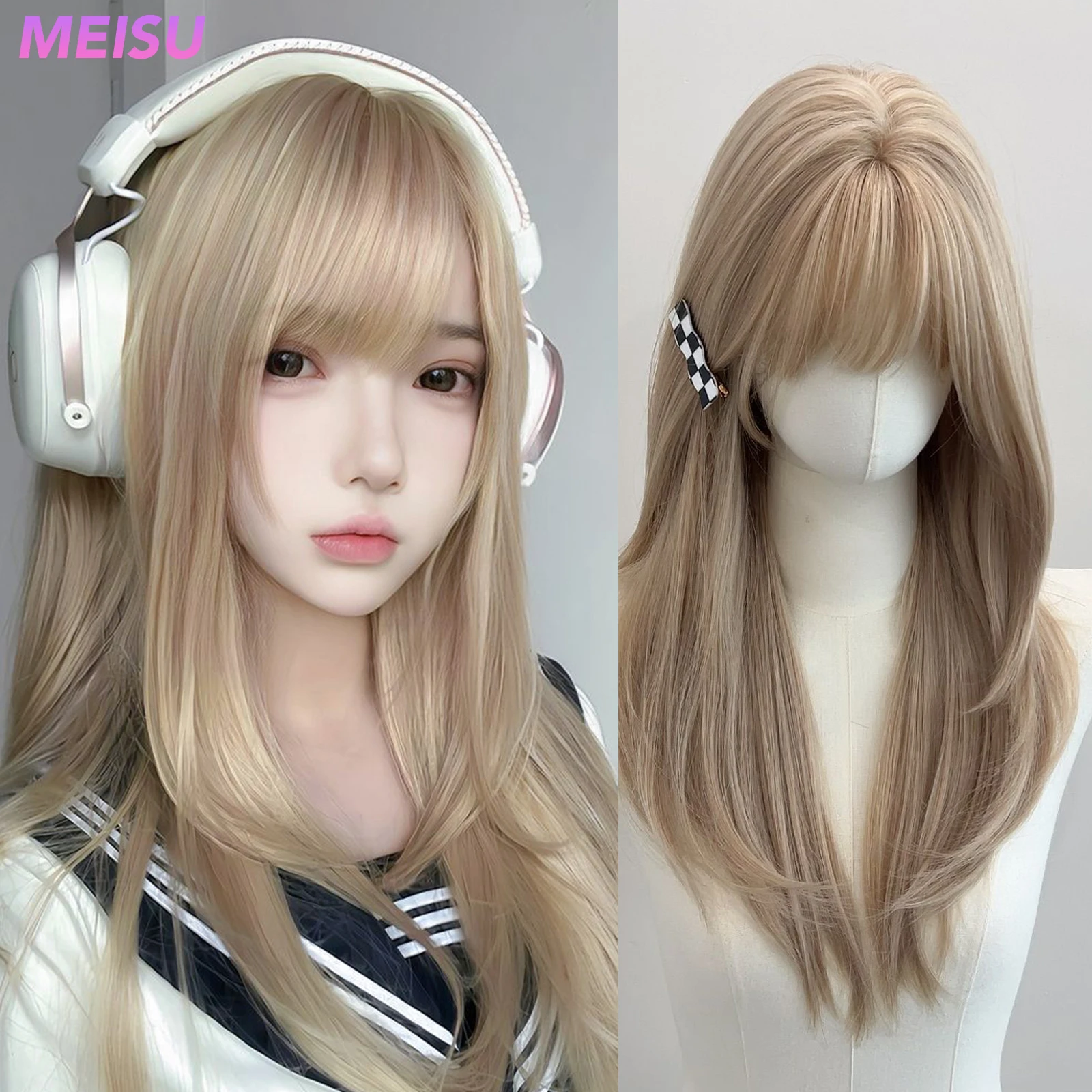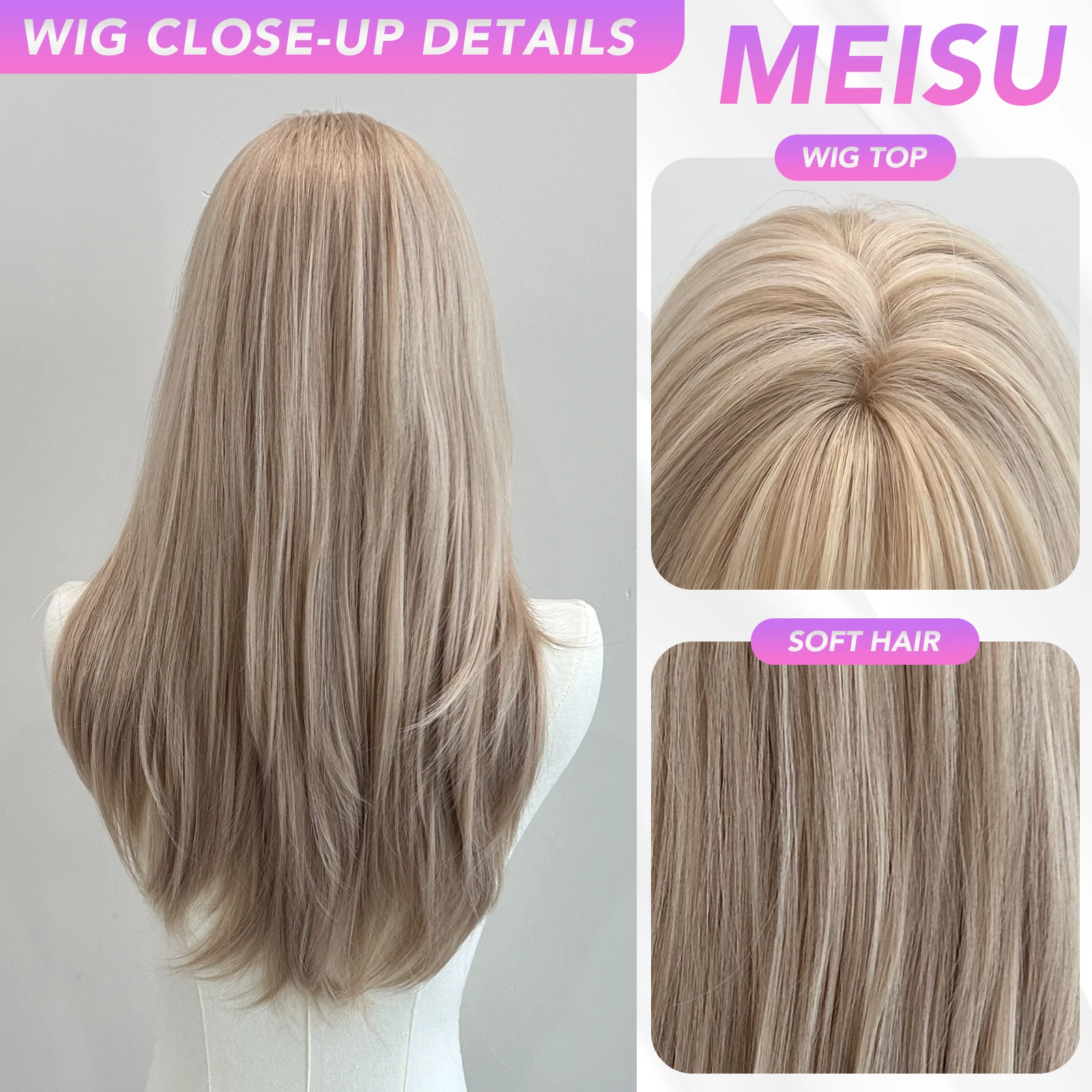 MEISU 24 Inch Synthetic Long Straight Bangs Wig Platinum Layered Fiber Heat-Resistant Natural Smooth Hair Party For Women