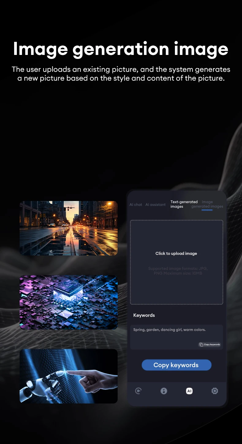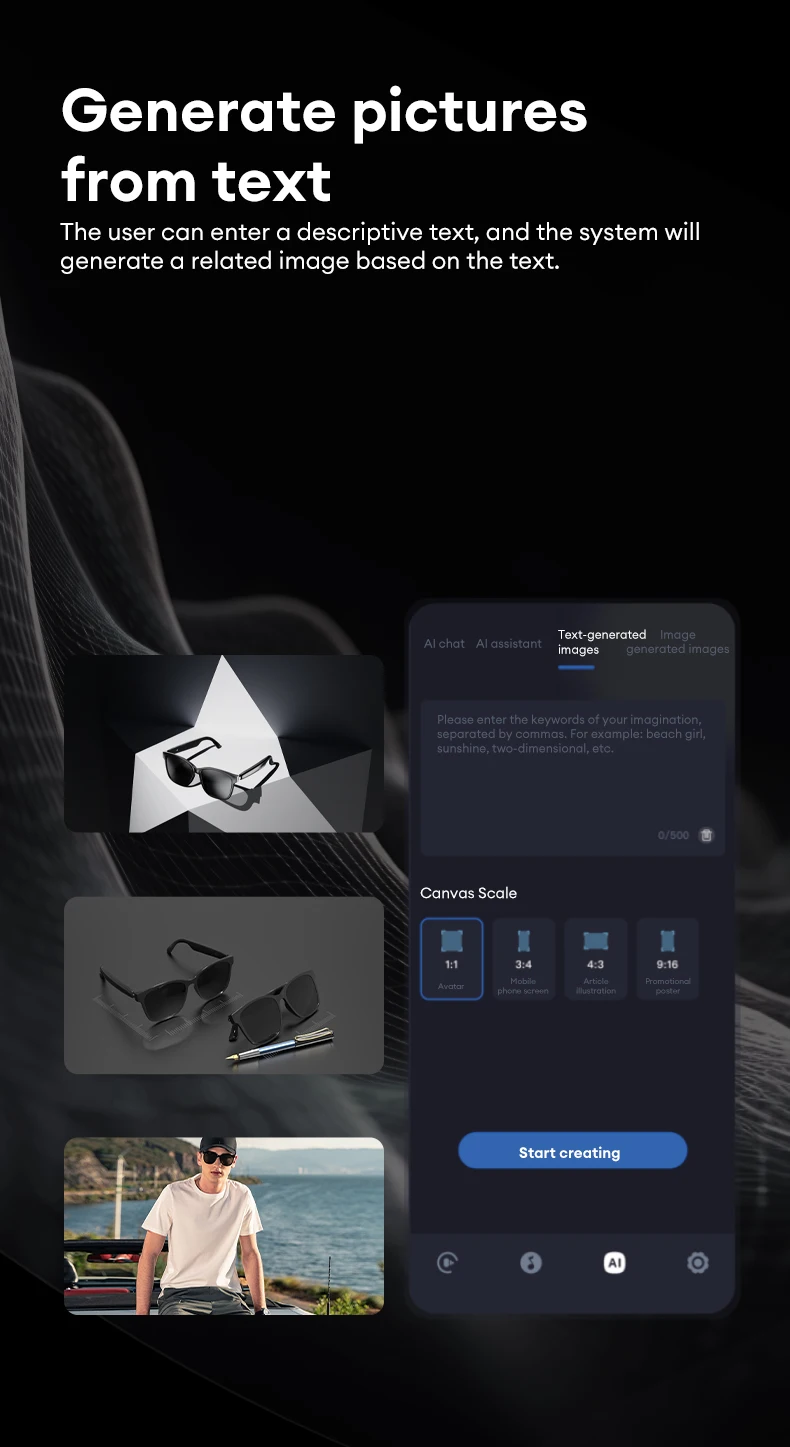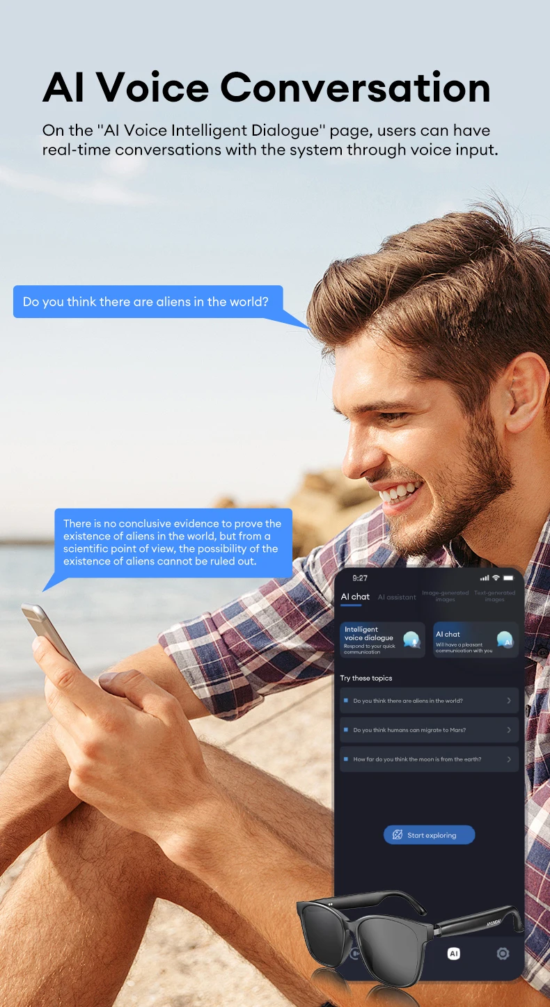 【Dual Image Generation Modes】: The AI Bluetooth Smart Glasses supports text-to-image generation (turning descriptive text into related images) and image-to-image generation (creating new images based on the style and content of uploaded ones).