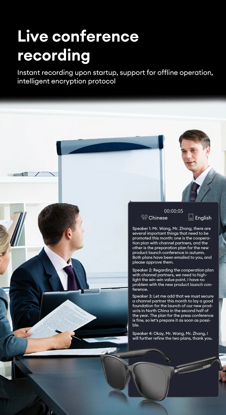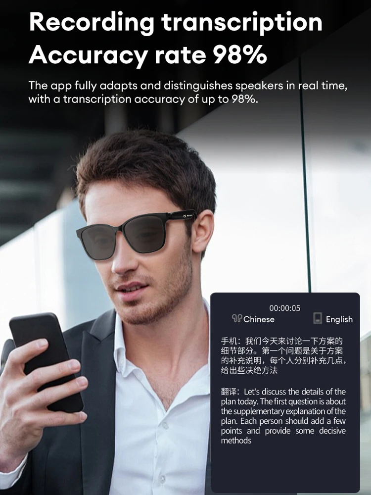 【High-Accuracy Recording & Transcription】: This MGALL MG-C8 AI HD Smart Glasses boasts a 98% transcription accuracy rate, with the supporting app fully adapting to real-time speaker distinction—ideal for capturing clear, categorized audio content in various scenarios.
