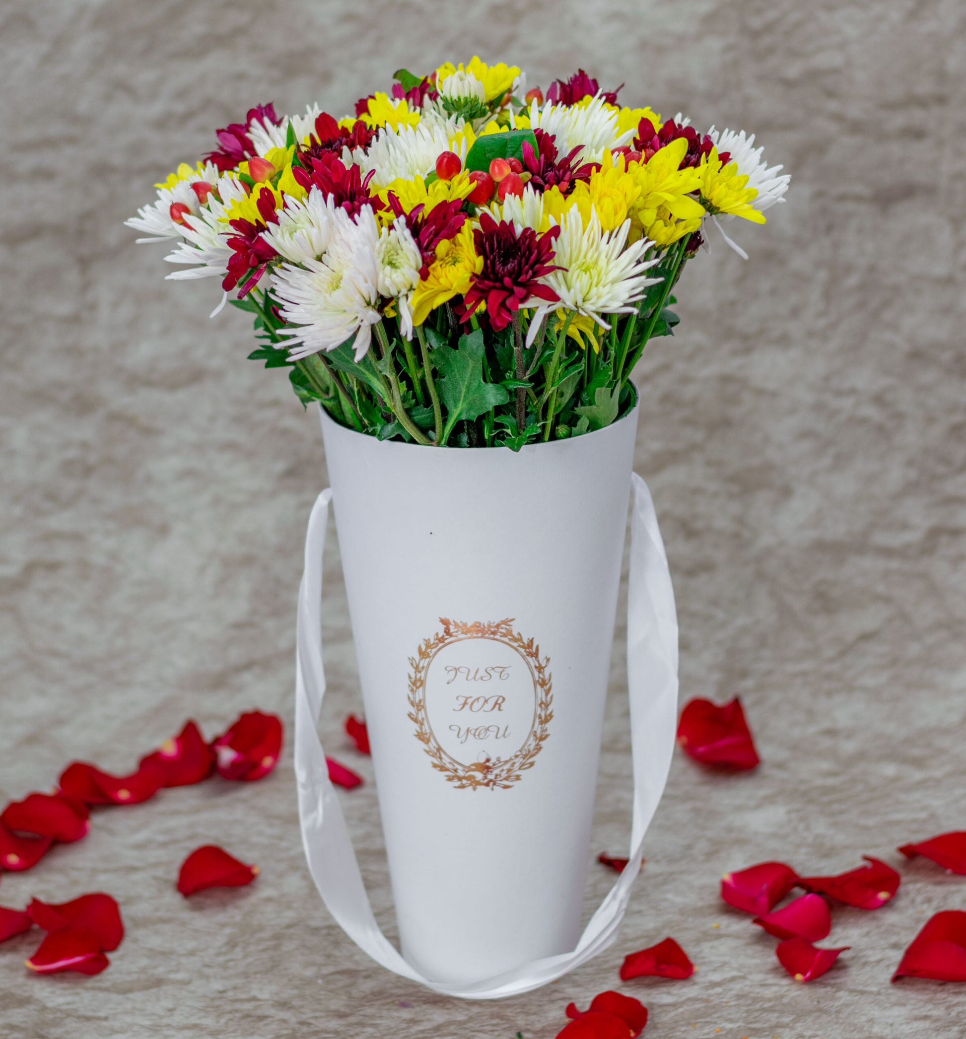 These flowers are a perfect gift for all daisies lovers. The flowers have been cut and arranged to keep them fresh for more than a week. Send a message of joy and happiness with this vase of flowers. View other Daisies bouquets here. View similar flowers put in a box.