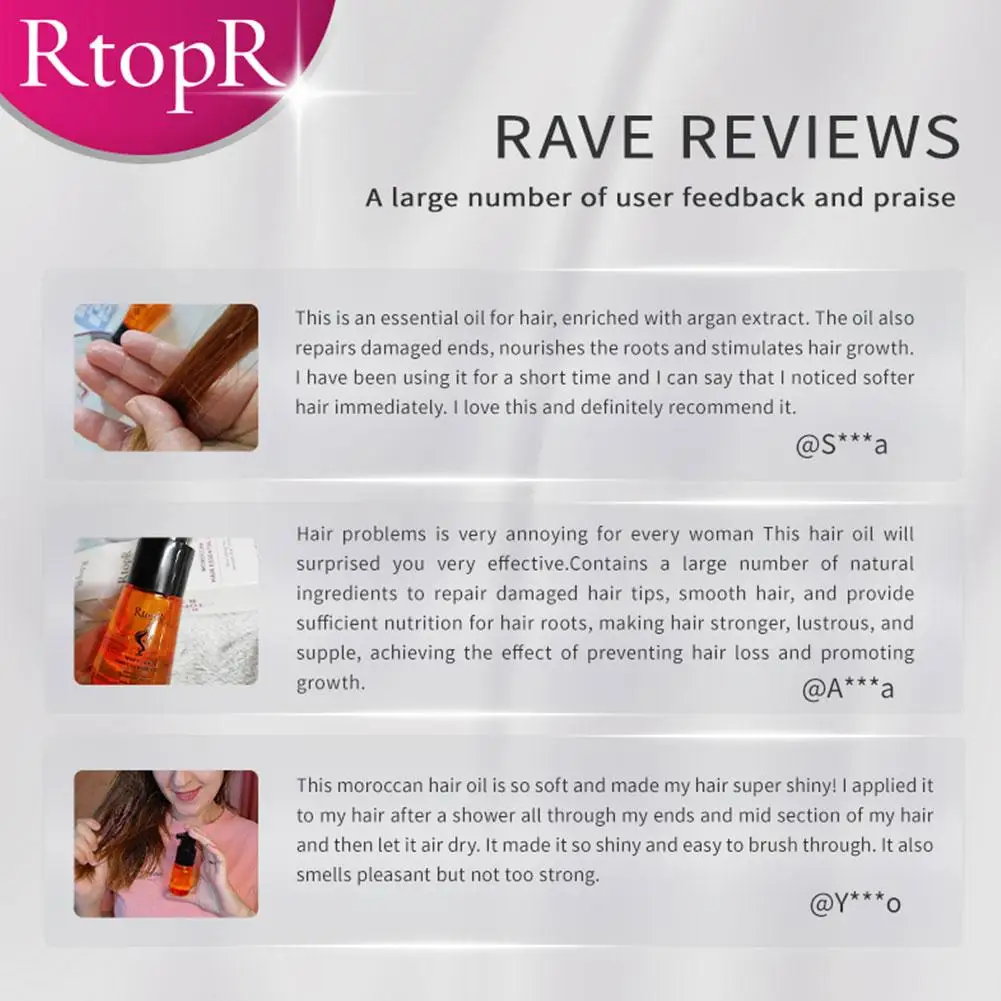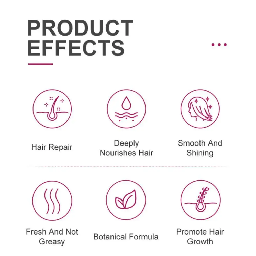 Rich in Moroccan nut extract, it can effectively resist dry, dehydrated and inelastic hair through the world's advanced extraction technology. It focuses on repairing damaged hair tips and smoothing hair instantly. At the same time, it provides sufficient nutrition for the hair root, making the hair stronger, brighter and softer. Help you prevent hair loss and promote hair growth.