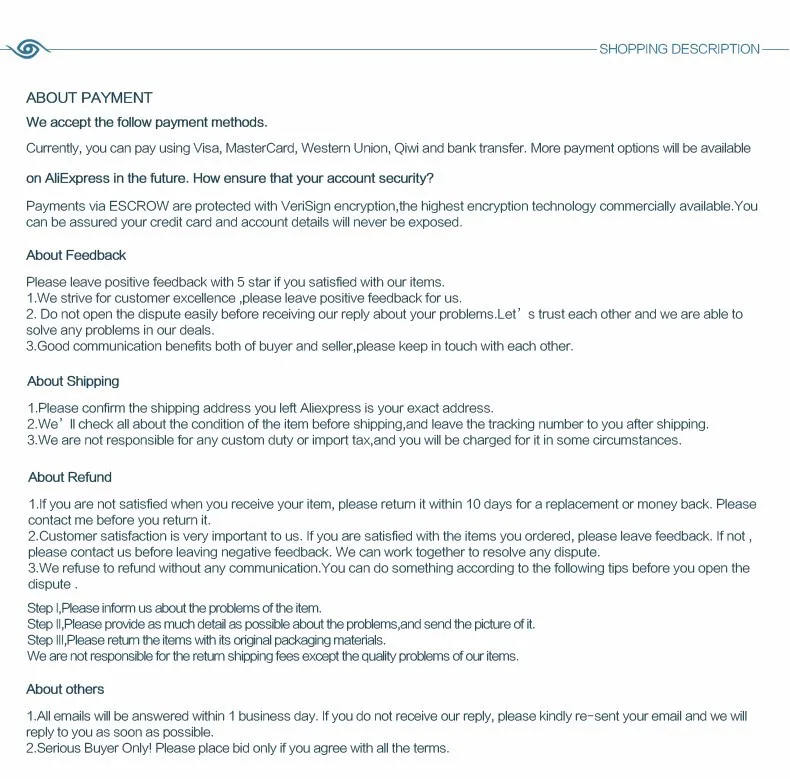Your satisfaction and comments are very important to us. If you like our products and service, please take a minute to leave us a positive feedback and 5 stars. We will appreciate it very much. If you are not happy, Please feel free to contact us before leaving a Neutral or Negative feedback, we will try our best to work out the problems.