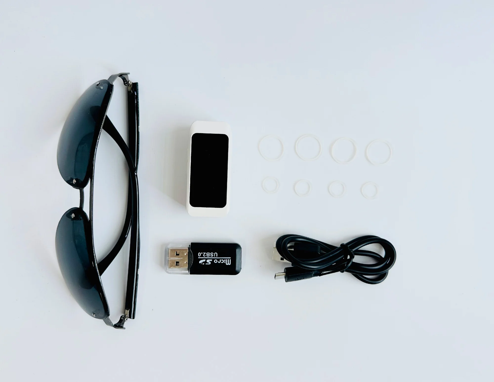 attaches to eyeglass temples. Captures first-person perspectives effortlessly,