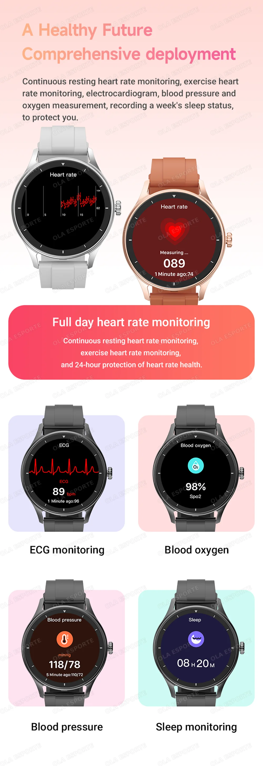 Metrics measured: Heart Rate Monitor,Women's Health Monitoring,Blood Oxygen Monitor,Sleep Monitor,Blood Pressure Monitor,Body Temperature Monitor,Stress Monitor