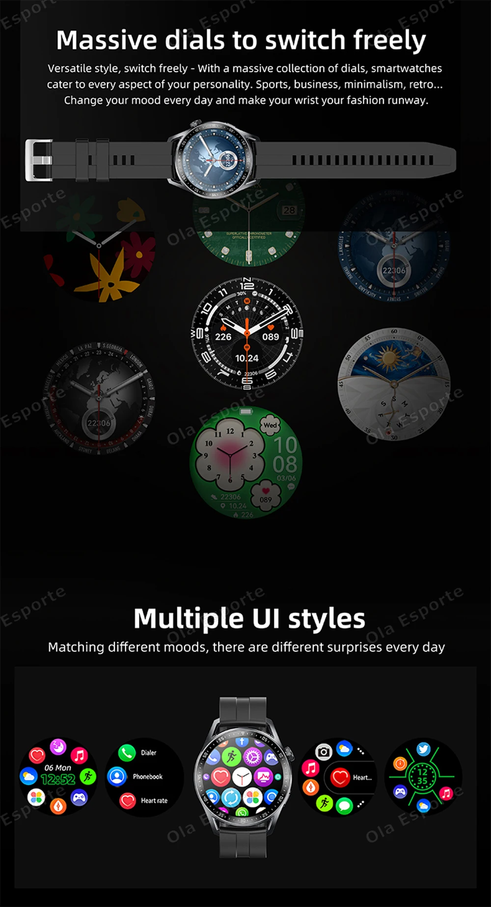 • Various Watch Faces: Choose from a variety of watch faces to match your style and mood.