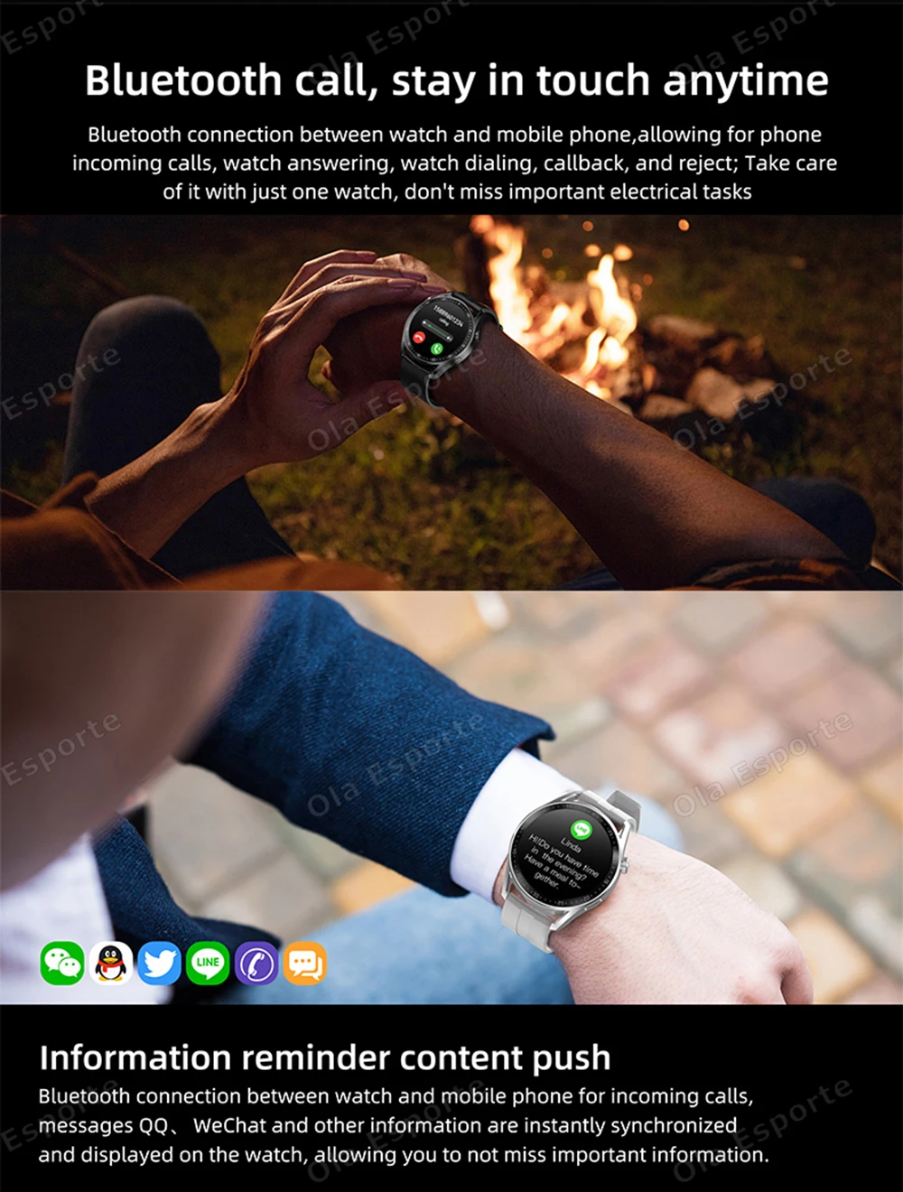 • Notification: Synchronous incoming message notification from Notification Center on your phone (SMS,Facebook,INS,Twitter,Yeasmaie,Whats app, etc.), incoming call reminder.
