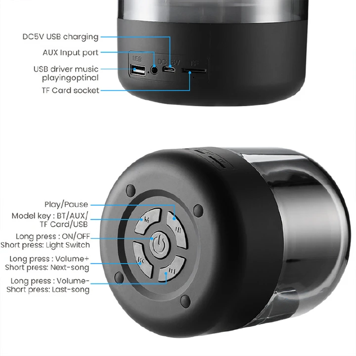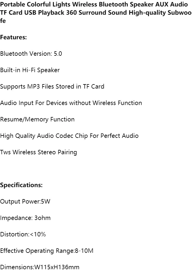 Portable Colorful Lights Wireless Bluetooth Speaker AUX Audio TF Card USB Playback 360 Surround Sound High-quality Subwoofe