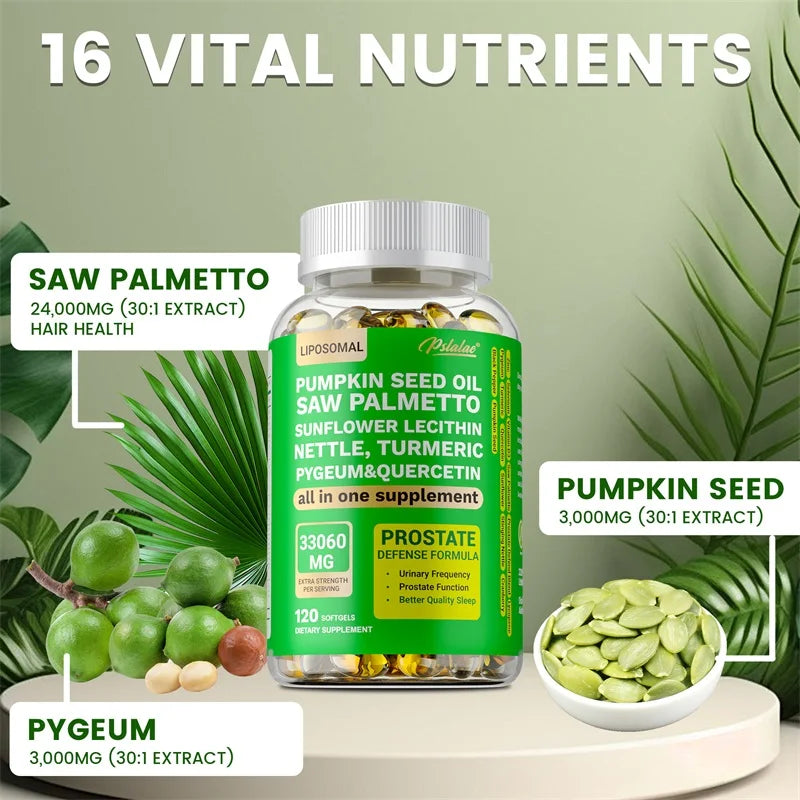 Comprehensive Prostate and Urology Care - Our carefully formulated blend avoids the high doses commonly found in similar products and focuses on the dosage of pumpkin seed and saw palmetto supplements for men. It ensures optimal care without the worry of overdosage.