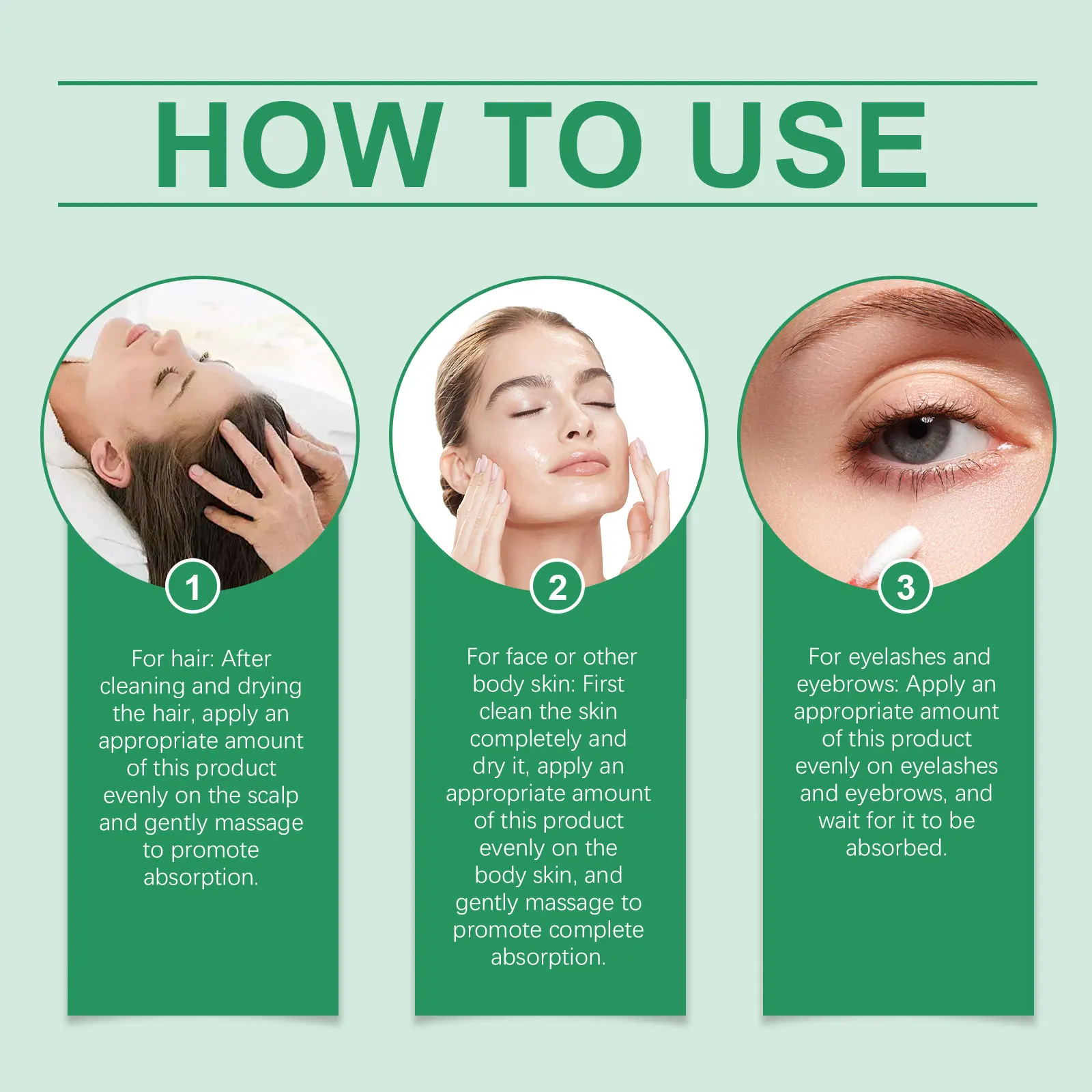 3. For eyelashes and eyebrows: Apply an appropriate amount of this product evenly on eyelashes and eyebrows, and wait for it to be absorbed.