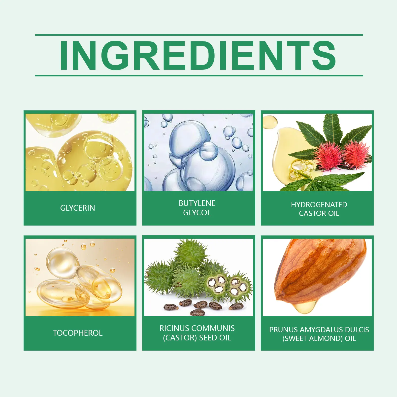 INGREDIENTS:GLYCERIN、BUTYLENE GLYCOL、HYDROGENATED CASTOR OIL、TOCOPHEROL、RICINUS COMMUNIS (CASTOR) SEED OIL、PRUNUS AMYGDALUS DULCIS (SWEET ALMOND) OIL
