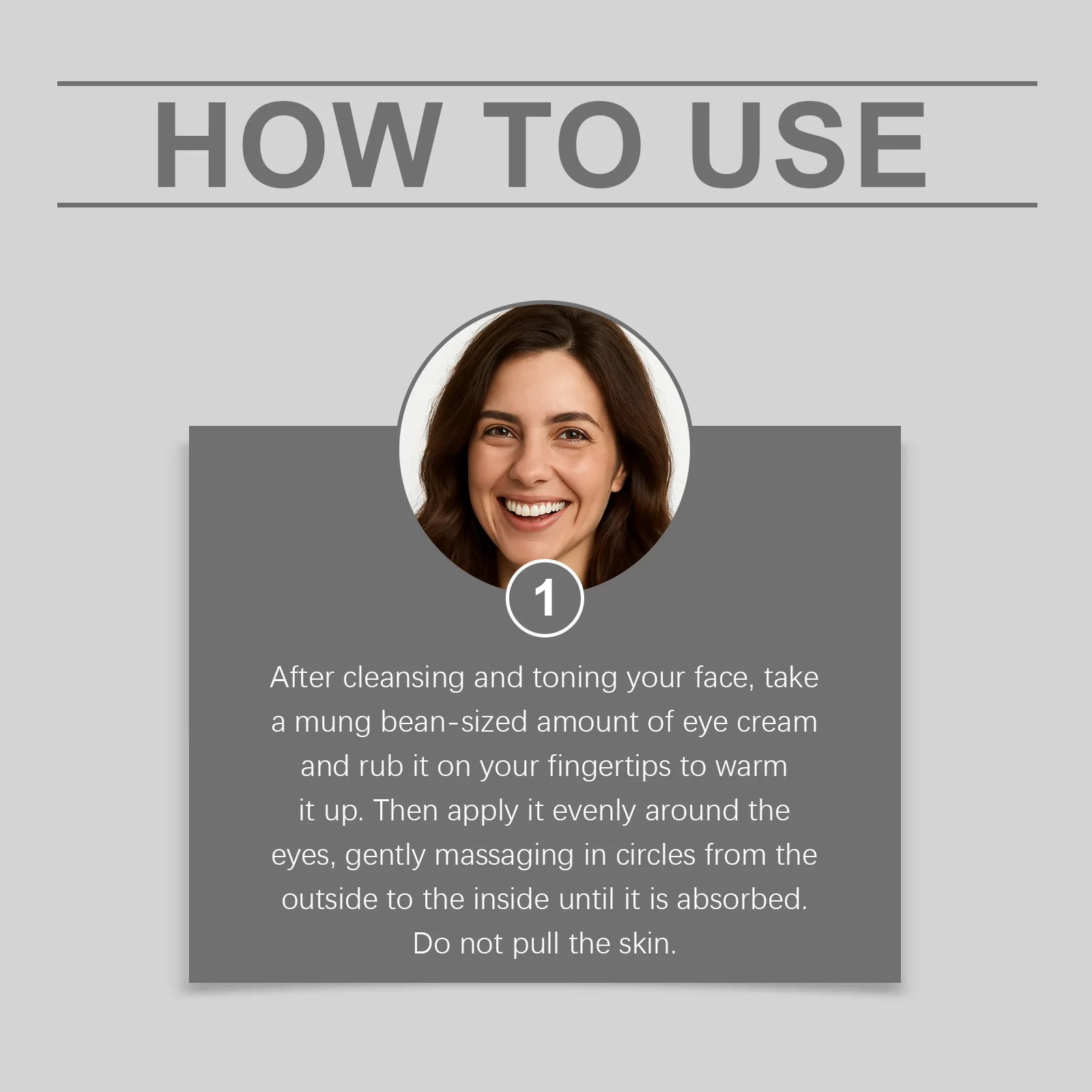 After cleansing and toning your face, take a mung bean-sized amount of eye cream and rub it on your fingertips to warm it up. Then apply it evenly around the eyes, gently massaging in circles from the outside to the inside until it is absorbed do not pull the skin.