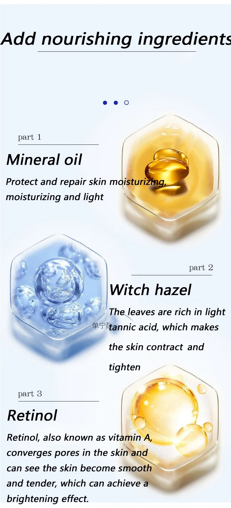 3.[Effect]: 2.5% pure Retinol helps combat the five visible signs of aging:wrinkles, fine lines, uneven skin tone, rough texture, and loss of firmness. Increases skin elasticity, promotes collagen production, and stimulates skin cells renewal to nourish skin whitening and moisturizing.