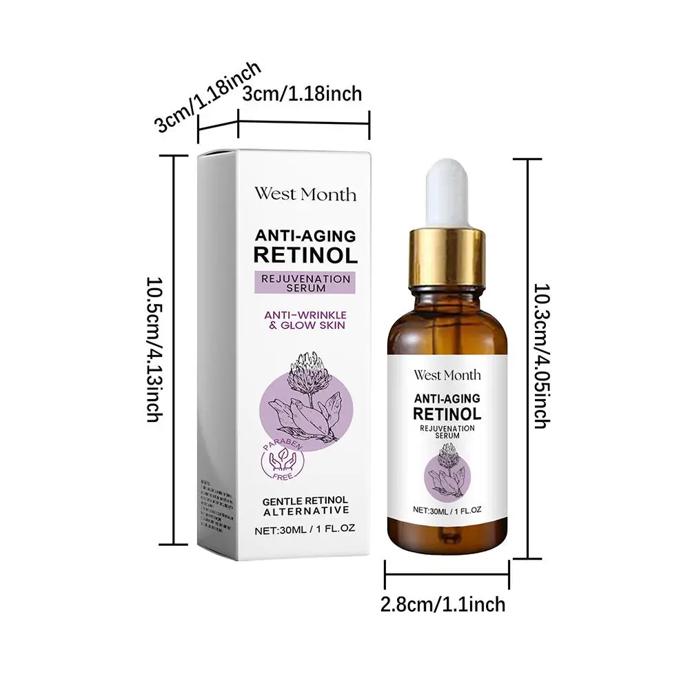 4. Even skin tone and skin: Retinol Serum can promote skin metabolism and cell renewal, reduce pigmentation, fade dark spots and dullness,the overall skin tone, and make the skin brighter and more translucent.